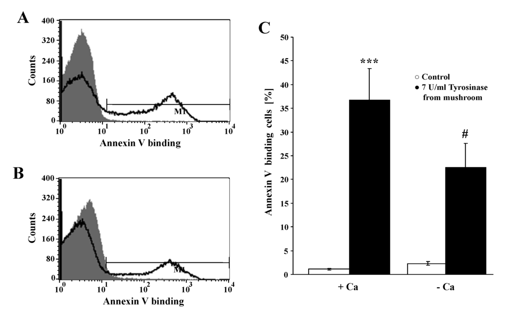 Effect of Ca2+ withdrawal on tyrosinase- induced annexin-V-binding. (A,B) Original histograms of annexin V binding erythrocytes following exposure for 24 h to Ringer solution without (grey shadow) and with (black line) presence 7 U/mL tyrosinase in the presence (A) and absence (B) of calcium. M1 indicates the gating of annexin V binding cells; (C) arithmetic means ± SEM (n = 4) of the percentage of annexin-V-binding erythrocytes after a 24 h treatment with Ringer solution without (white bar) or with (black bars) 7 U/mL tyrosinase in the presence (left bars, +Ca) and absence (right bars, −Ca) of calcium. *** (p < 0.001) indicates significant difference from the absence of tyrosinase (ANOVA) # (p < 0.05) indicates significant difference from the respective values in the presence of Ca2+.