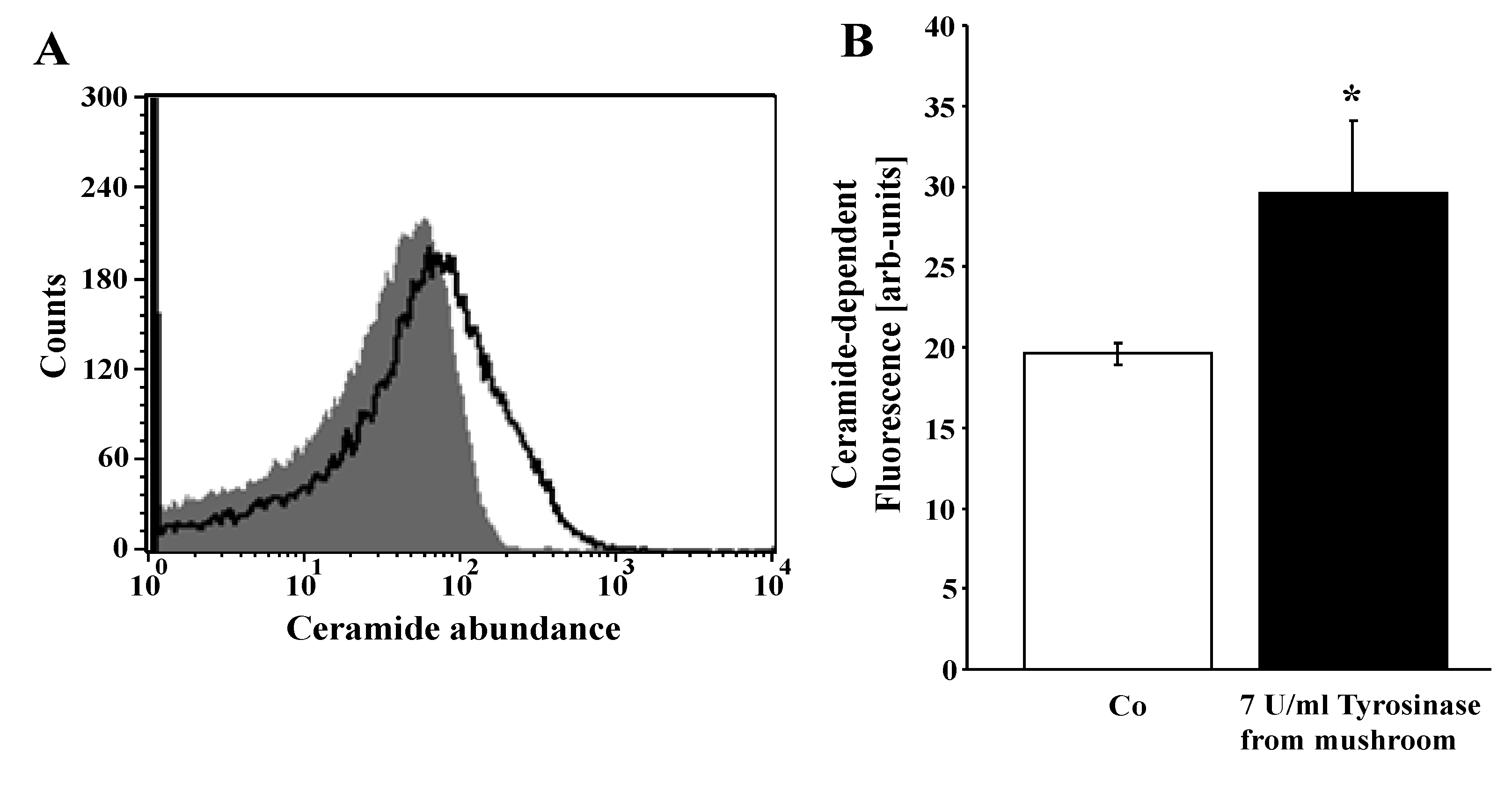 Effect of tyrosinase on ceramide formation. (A) Original histogram of ceramide surface abundance of erythrocytes following exposure for 24 h to Ringer solution without (grey shadow) and with (black line) presence of 7 U/mL tyrosinase; (B) arithmetic means ± SEM (n = 4) of ceramide abundance after a 24-h incubation in Ringer solution without (white bar) or with 7 U/mL tyrosinase (black bar). * (p < 0.05) indicates significant difference from the absence of tyrosinase (t test).