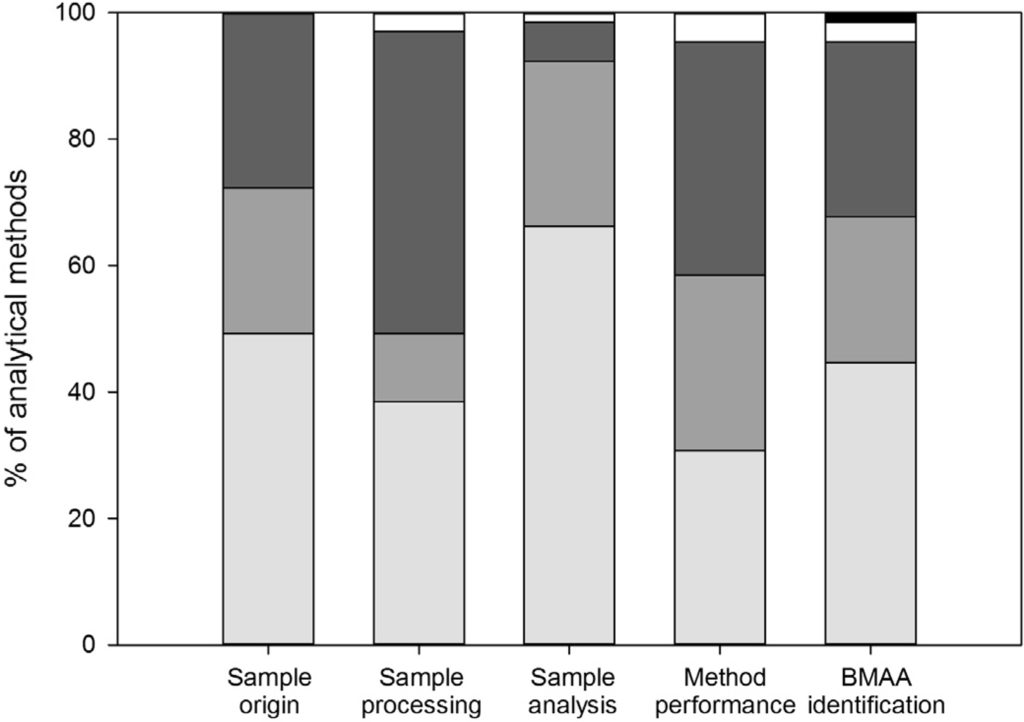As detailed above, BMAA can only be reliably detected if the appropriate methods are used. Furthermore, for results to be clear and comparable, it is essential to report methods and results adequately. I here evaluate the methods and results sections of studies on BMAA detection in aquatic ecosystems. For each method, I checked if the following basic information was well reported: sample origin and storage, sample processing, sample analysis, method performance and BMAA identification.