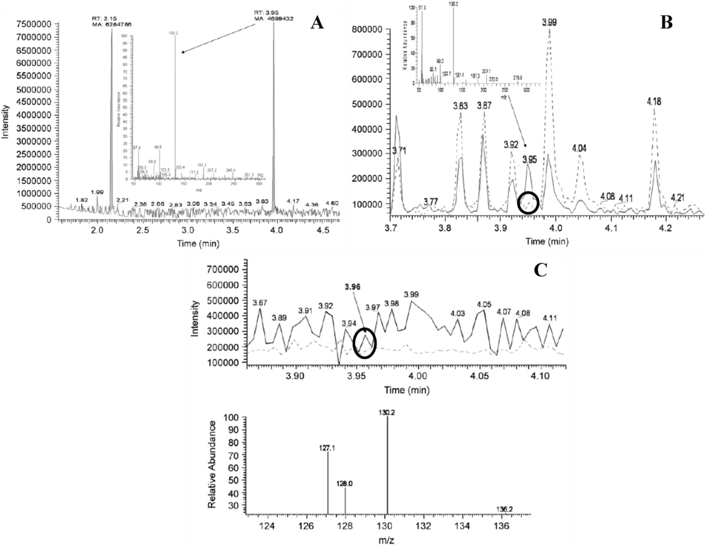 GC-MS chromatograms and spectra of standards, spiked and unspiked cyanobacterial samples as published in []. Circles indicate detection of unspiked BMAA and are added in this review. (A) Chromatogram of standard BMAA (Retention time (Rt) 3.95 min; m/z 130.2) measured against an internal standard of norvaline (Rt 2.15 min, m/z 158, 72); (B) GC-MS detection of BMAA (dotted line) detected from strain R202.1 spiked with an authenticated BMAA standard (Sigma, solid line); (C) Comparison of BMAA detection using a lyophilized (dotted line) culture and fresh (solid line) culture (strain Q411.1 Leptolyngbya). Reprinted from [], with permission from Elsevier.