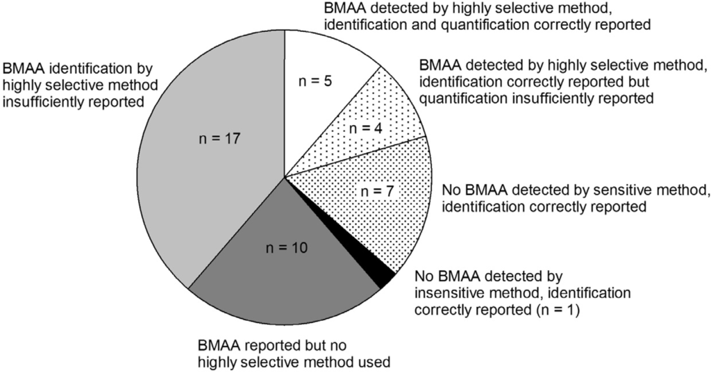 Nevertheless, the use and description of analytical techniques are not the only sources of confusion in aquatic BMAA research. It lacks a solid foundation as the conclusions drawn in some of the key articles on analysis [,,], production by cyanobacteria [] and human exposure through cyanobacteria [] were either unclear or not supported by the presented data. Finally, literature interpretation is hindered by occasional selective referencing to positive findings and by lack of a critical evaluation of the presented work.