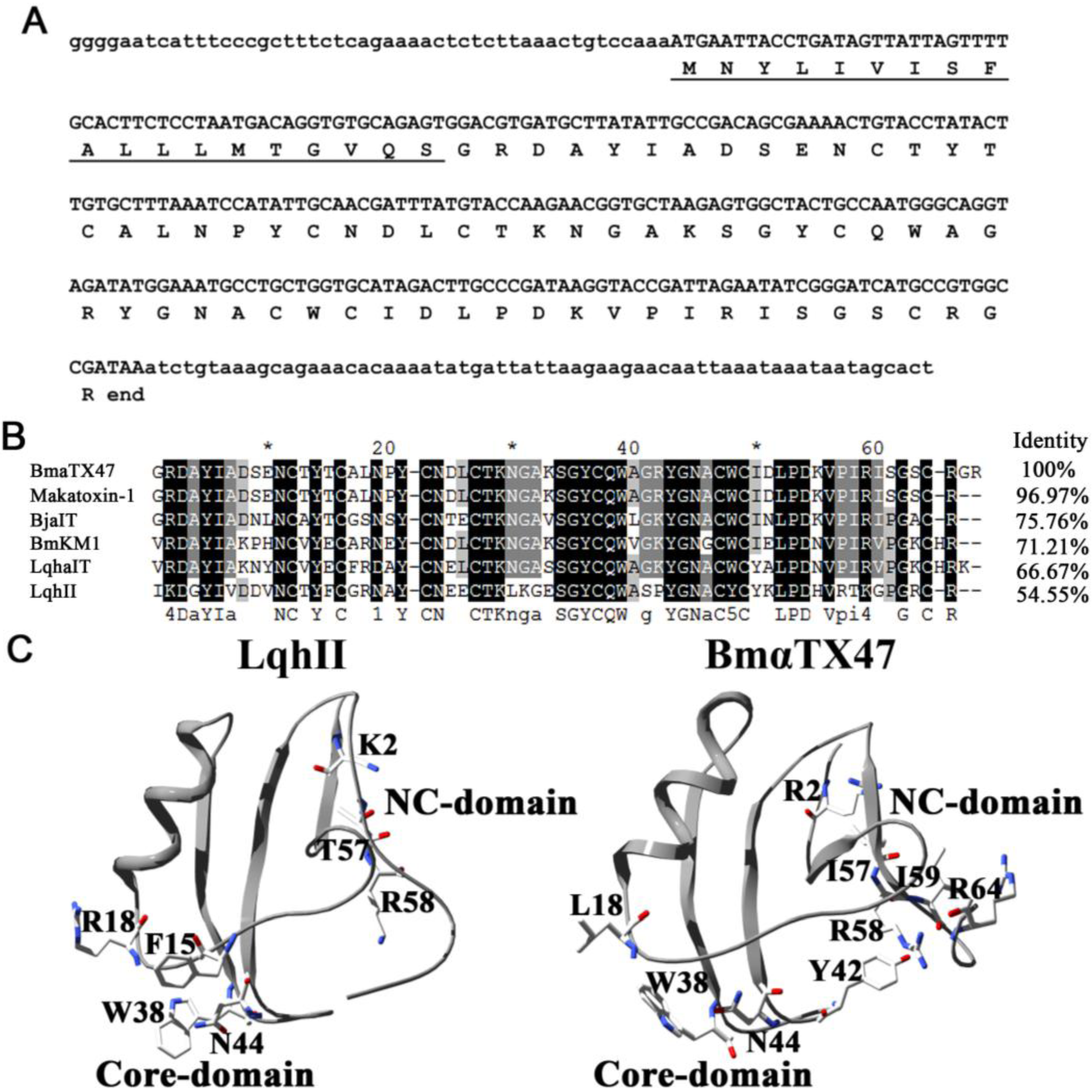 Sequence and structural analysis of the α-scorpion toxin BmαTX47. (A) The precursor nucleotide and amino acids sequences of BmαTX47. The signal peptide is underlined; (B) Amino acid sequence alignment of BmαTX47 with the known α-scorpion toxins including Makatoxin-1 (UniProtKB/Swiss-Prot: P56569.1), BmKM1 (UniProtKB/Swiss-Prot: P45697.2), BjαIT (UniProtKB/Swiss-Prot: Q56TT9.1), LqhII (UniProtKB/Swiss-Prot: P59355.1) and LqhαIT (UniProtKB/Swiss-Prot: P17728.2); (C) Structural modeling and analysis of BmαTX47. The experimental and putative functional residues in LqhII and BmαTX47 were labeled, respectively. The Lys2, Thr57 and Arg58 were functional residues composing the NC-domain, while the residues Phe15, Arg18, Trp38 and Asn44 constituted the Core-domain of LqhII. Accordingly, the residues Arg2, Ile57, Arg58, Ile59 and Arg64 were putative functional residues in NC-domain, while Leu18, Trp38, Tyr42 and Asn44 were possibly important residues in Core-domain of BmαTX47, respectively.