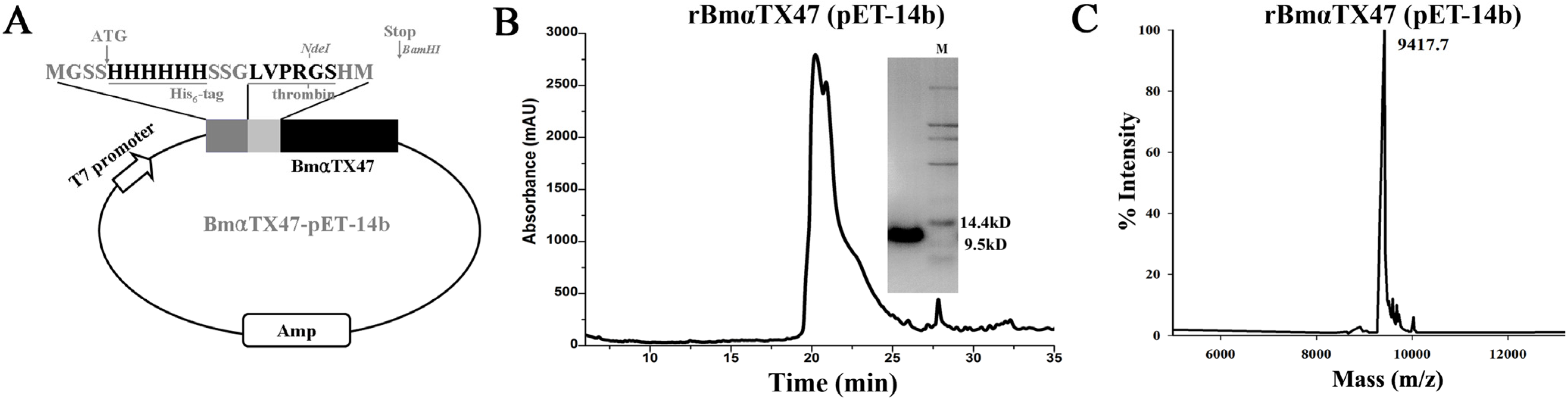 Expression, purification and identification of rBmαTX47 toxin with pET-14b vector. (A) Construction of expression vector BmαTX47-pET-14b. The nucleotide sequence encoding mature BmαTX47 peptide was inserted between NdeI and BamHI sites of the vector pET-14b downstream of the His6-tag and thrombin cleavage sequence. The full sequence of toxin rBmαTX47 was MGSSHHHHHHSSGLVPRGSHM-BmαTX47; (B) Purification of the refolded rBmαTX47 from pET-14b vector by RP-HPLC together with the tricine-SDS-PAGE analysis; (C) Mass spectrum of rBmαTX47 from the MALDI-TOF-MS. The calculated molecular weight was 9416.3 Da, and the measured value was 9417.7 Da.