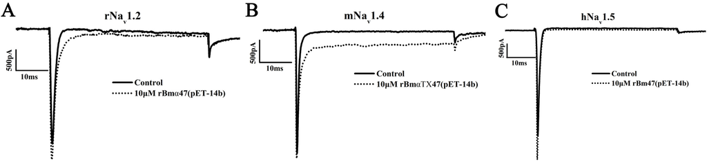 Pharmacological properties of rBmαTX47 on rNav1.2, mNav1.4 and hNav1.5 channels. (A) rNav1.2 current traces in the absence (control) or presence of 10 μM rBmαTX47 from the expression vector pET-14b; (B) mNav1.4 current traces in the absence (control) or presence of 10 μM rBmαTX47 from the expression vector pET-14b; (C) hNav1.5 current traces in the absence (control) or presence of 10 μM rBmαTX47 from the expression vector pET-14b.