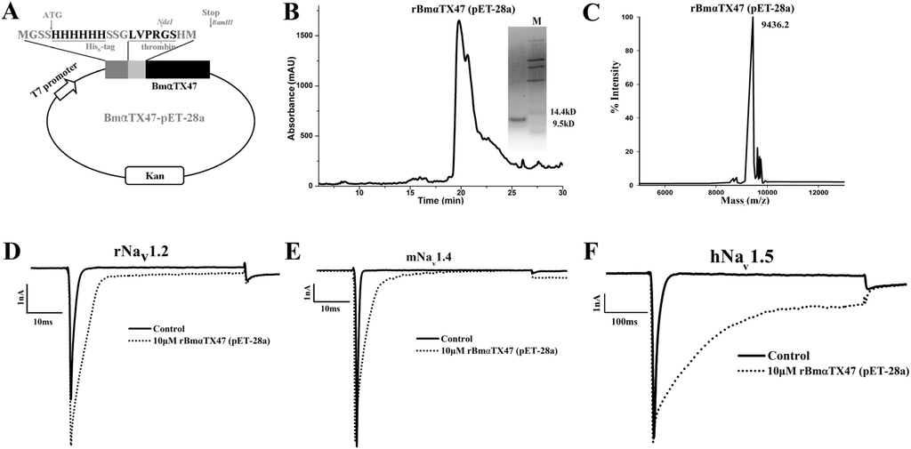 Preparation and pharmacological features of rBmαTX47 from pET-28a vector. (A) Construction of expression vector BmαTX47-pET-28a. The nucleotide sequence encoding mature BmαTX47 peptide was inserted between NdeI and BamHI sites of the vector pET-28a downstream of the His6-tag and thrombin cleavage sequence. The full sequence of toxin rBmαTX47 was MGSSHHHHHHSSGLVPRGSHM-BmαTX47; (B) Purification of rBmαTX47 from pET-28a vector by RP-HPLC together with the tricine-SDS-PAGE analysis; (C) Mass spectrum of rBmαTX47 from the MALDI-TOF-MS. The calculated molecular weight was 9416.3 Da, and the measured value was 9436.2 Da; (D) rNav1.2 current traces in the absence (control) or presence of 10 μM rBmαTX47 produced from the expression vector pET-28a; (E) mNav1.4 current traces in the absence (control) or presence of 10 μM rBmαTX47 produced from the expression vector pET-28a; (F) hNav1.5 current traces in the absence (control) or presence of 10 μM rBmαTX47 produced from the expression vector pET-28a.