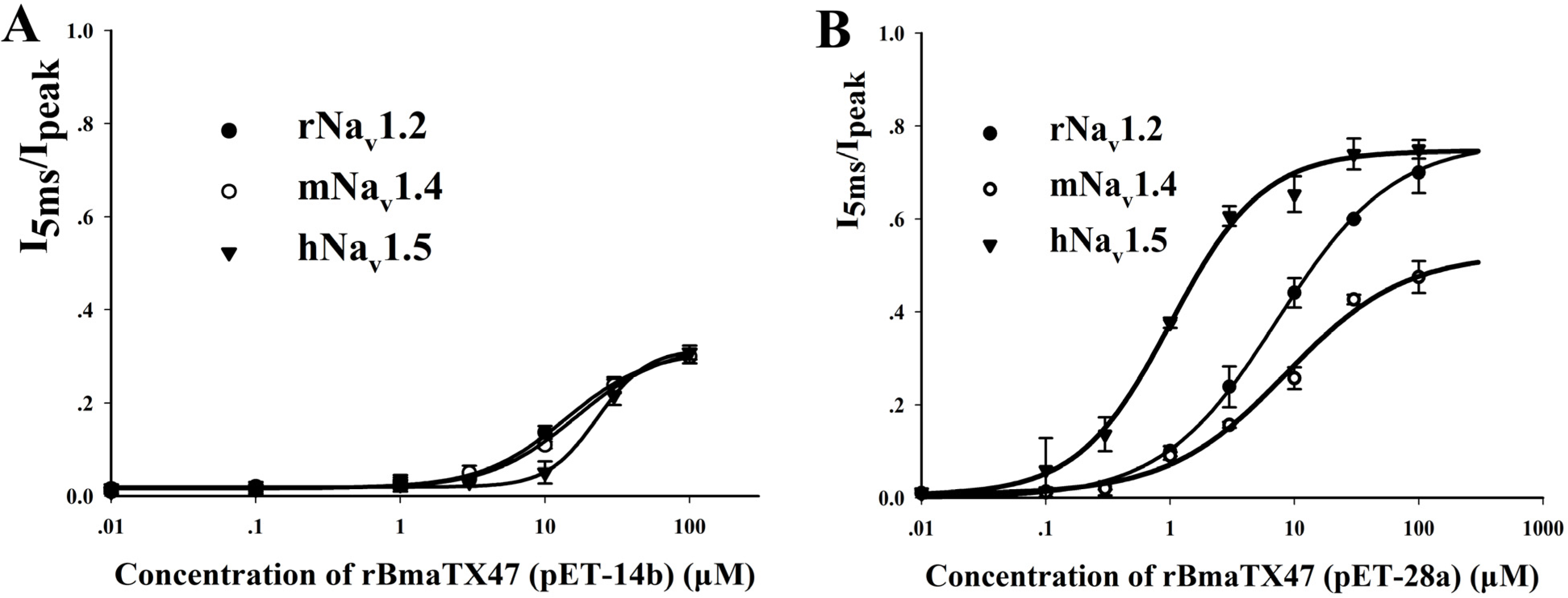 Pharmacological properties of rBmαTX47 from the different expression vectors on rNav1.2, mNav1.4 and hNav1.5 channels. (A) Dose-response curves of rBmαTX47 (pET-14b) on rNav1.2, mNav1.4 and hNav1.5 channels; (B) Dose-response curves of rBmαTX47 (pET-28a) on rNav1.2, mNav1.4 and hNav1.5 channels. Data represent the mean ± SE of at least three independent experiments.