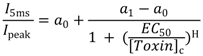 Here, H is the Hill coefficient; a1 − a0 represents the recorded maximal effect of toxin-induced inhibition at saturating concentrations; a0 is the measured value before applying the toxin; [Toxin]c is the toxin concentration; and EC50 represents the toxin concentration at the half-maximal effect. Data analysis was performed using SigmaPlot. All data are shown as arithmetic mean ± SE.