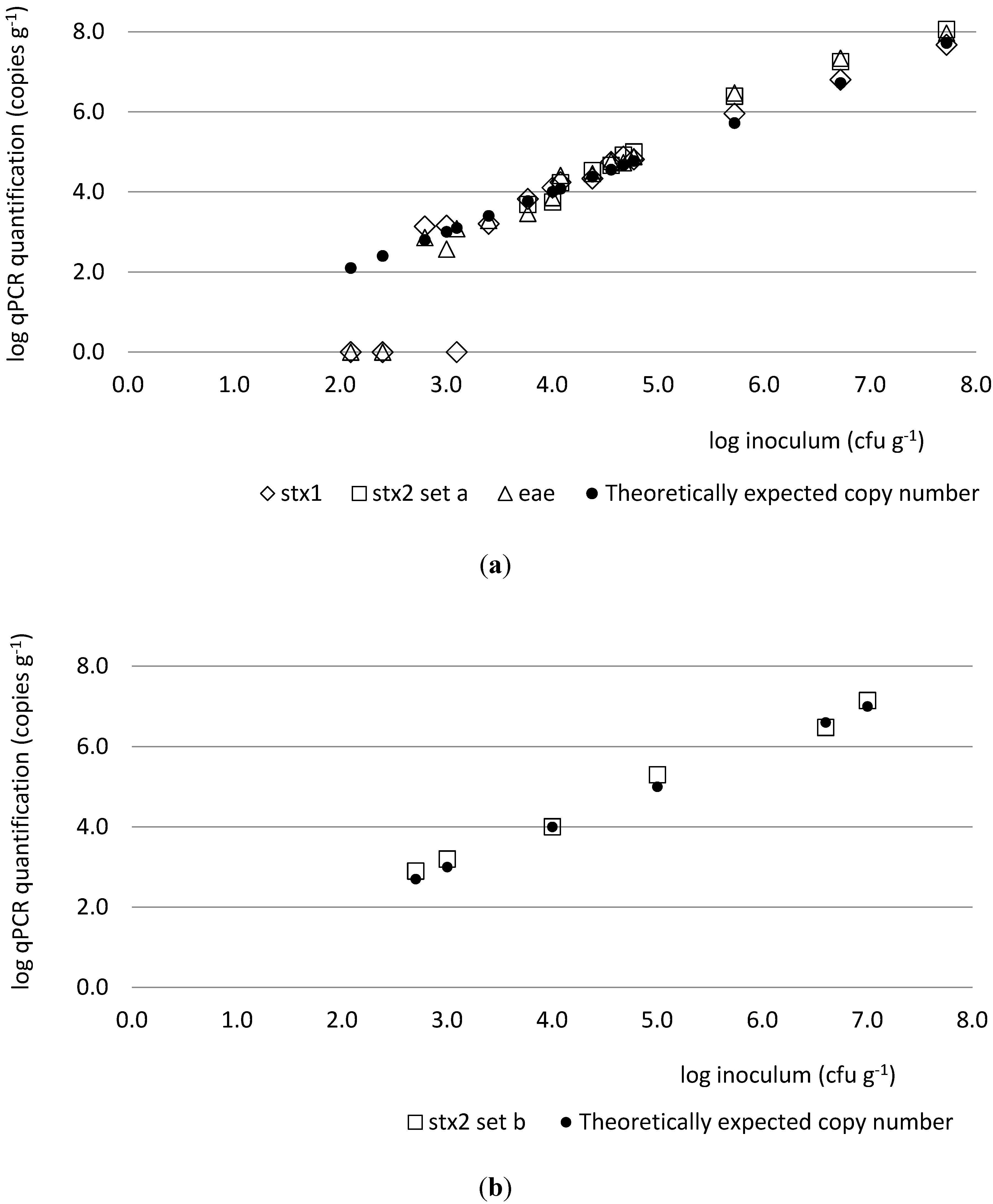 The limit of quantification (LOQ) was <2.7 log copies g−1 feces for stx1, stx2 (primer-probe set b) and eae, and <3.7 log copies g−1 feces for stx2 (primer-probe set a) (Figure 1a). The quantification of genes did not differ more than 1 log from the theoretically calculated number based on the inoculums of strain MB3936 or MB4378 for concentrations ≥2.7 log CFU g−1 for stx1, stx2 (primer-probe set b) and eae, and for concentrations ≥3.7 log CFU g−1 for stx2 (primer-probe set a) (Figure 1b). The reference sample (blank) was found negative for stx1, stx2 and eae.