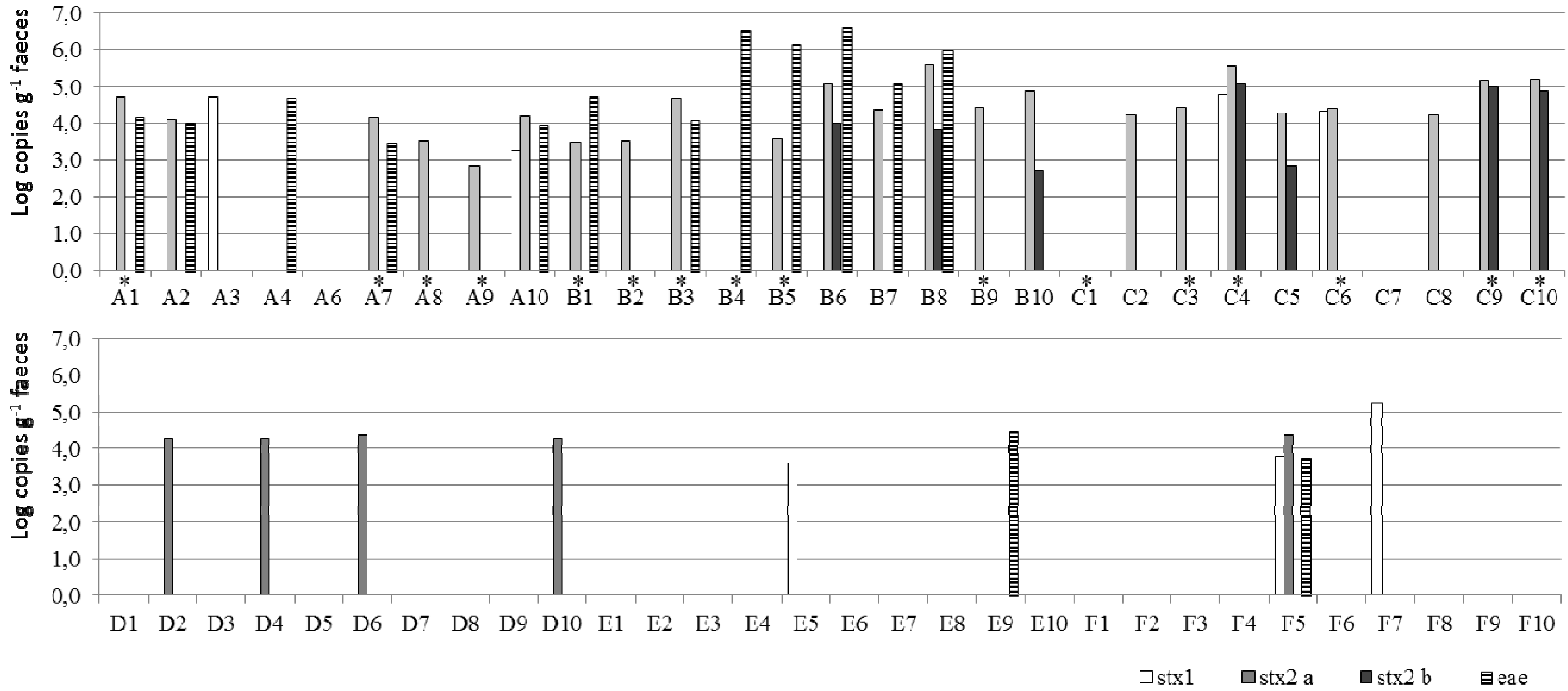 Cattle fecal samples for which stx1 or stx2 could be quantified were regarded as stx-positive. On the farm level, stx-positive animals were counted to determine the farm prevalence.