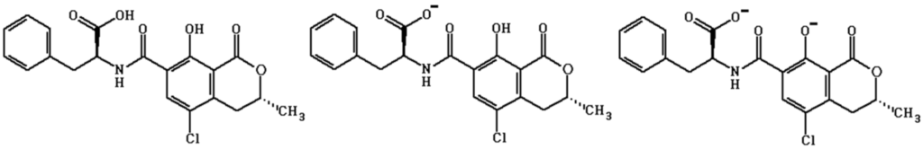 Chemical structures of nonionic, monoanionic and dianionic ochratoxin A (OTA).