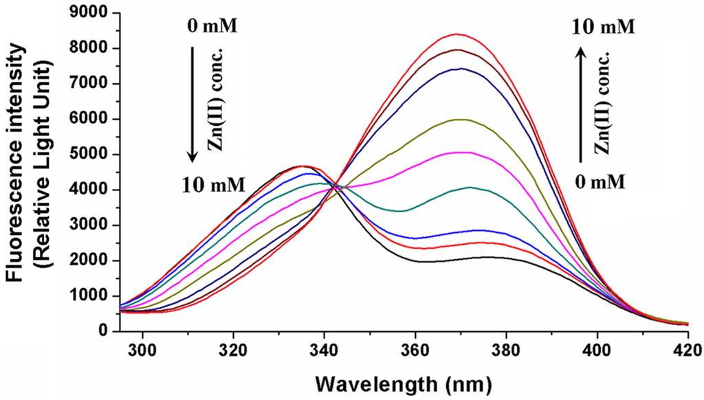 Similarly to magnesium ions [13], zinc ions also form a complex with OTA and show a strong preference toward the dianionic form of OTA. A major decrease with a consecutive increase of the peak intensities at 332 nm and 370 nm was observed in the excitation spectra of OTA upon the addition of Zn2+ in a 0.03 M ammonium acetate buffer at pH 6.4 (Figure 2). These variations are due to a decrease in the amount of monoanionic OTA with an increase in the amount of the Zn2+-OTA2− complex in the solution, respectively. The complex formation with zinc ions results in a blue shift (443 nm→431 nm) of the emission peak of OTA2−. Furthermore, its fluorescence intensity significantly elevates (Figure 3). Zn2+-OTA2− complexation causes a less pronounced increase in fluorescence intensity compared to that of its Mg2+ complex (in TRIS-HCl buffer, pH 7.4). Nevertheless, the stability constant of the Zn2+-OTA2− complex is 0.38 log units higher than that of Mg2+-OTA2−. The determined logK values of cation-OTA2− complexes at 25 °C and the corresponding thermodynamic parameters are summarized in Table 1. The thermodynamic parameters show that the increases of entropy at the complex formations are important in each case. The removal of the ions from their solvation shells results in entropy production, which might be one of the driving forces in the complex formation. These assumptions further support our previous argument that the dehydration of magnesium ions possesses a high importance during the process [13]. In addition, presumably, the partial dehydration of OTA also plays a role in the entropy production. It should be noted that the binding constant of Mg2+-OTA2− in TRIS-HCl (pH 7.4) is also 0.4 log units higher than that in phosphate buffered saline (PBS) buffer (pH 7.4). This discrepancy could result from the fact that PBS buffer contains a very high concentration of sodium ions (almost 150 mM), which can also form complexes with OTA. Even though the stability of Na+-OTA2− [13] is much lower than that of Mg2+-OTA2−, a large amount of sodium ions is still able to compete with Mg2+ for binding with OTA2−.