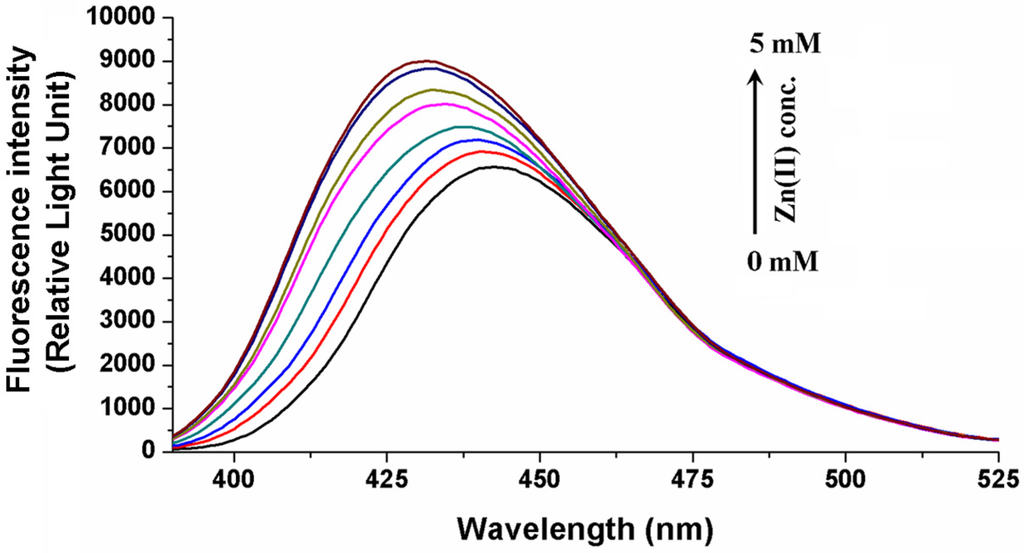 The fluorescence emission spectra of 1 µM OTA (λexc = 380 nm) in the presence of increasing Zn2+ concentrations in TRIS-HCl buffer (pH 7.4).