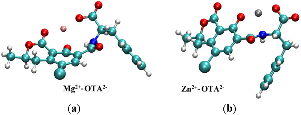 (a) [Mg2+-OTA2−] structure. The Mg2+ ion primarily interacts with three partially negatively charged oxygen atoms. Based on NBO analysis as implemented in the Gaussian program, the total charge on Mg2+ is 1.65 e, while there are −0.99 e, −0.87 e and −0.78 e charges on the three oxygen atoms (one in the carboxyl group, the phenolic oxygen and the oxo group). The amide nitrogen possesses a −0.63 e charge compared to the −0.64 e charge in the free OTA2−; (b) [Zn2+-OTA2−] structure. The Zn2+ ion can be found close to the two partially negatively charged oxygen atoms and to the nitrogen atom of the amide group. The total charge on Zn2+ is 1.38 e, while there are −0.83 e and −0.81 e charges on the two oxygen atoms (carboxyl and phenolic, respectively) and −0.73 e on the nitrogen atom.
