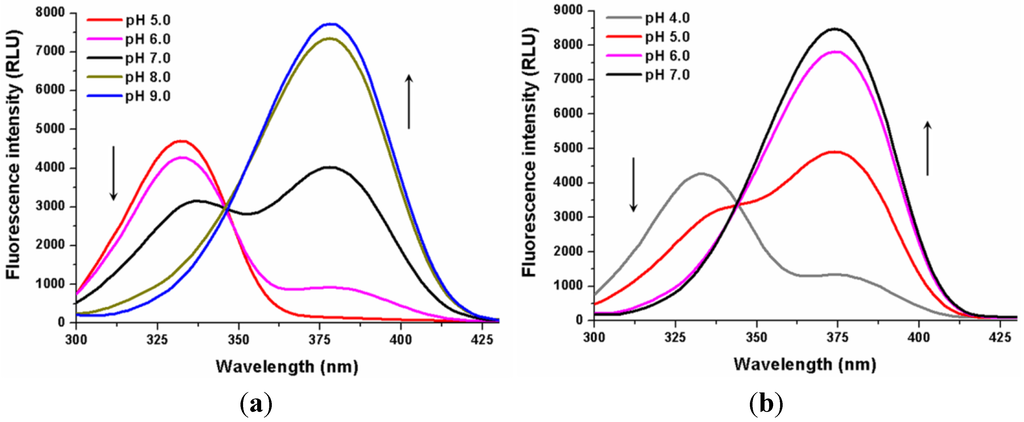 Fluorescence excitation spectra of 1 µM OTA in the absence (a) (λem = 443 nm) and in the presence (b) (λem = 427 nm) of 50 mM MgCl2 in 0.03-M ammonium acetate buffers at increasing pH (RLU = Relative Light Unit).