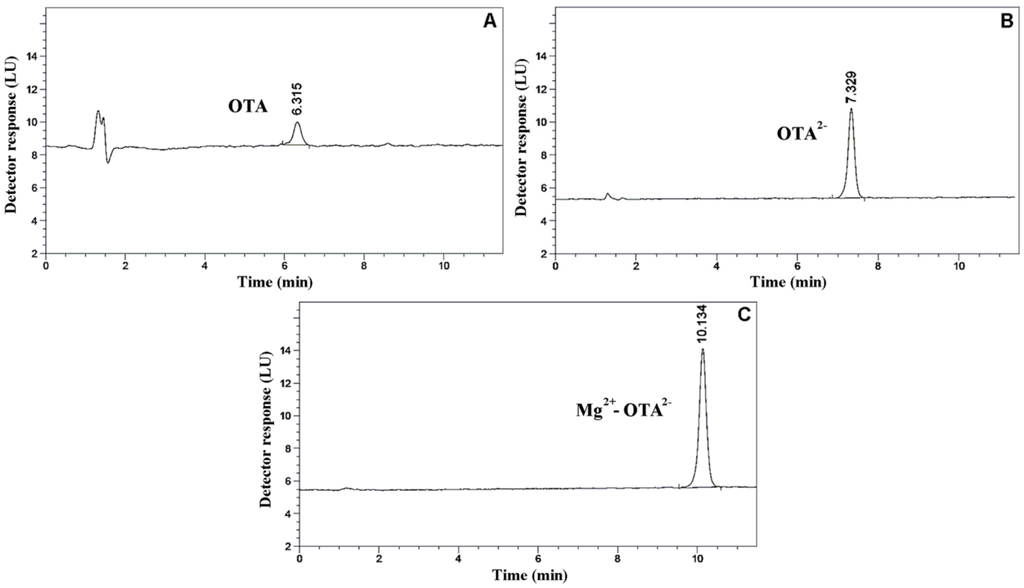 There is a wide range of analytical methods suitable for the sensitive quantification of OTA. Primarily, high performance liquid chromatographic (HPLC) methods are the most commonly used processes for food and other biological samples [19,20,21]. Since OTA is a highly fluorescent molecule, its quantitative determination with a fluorescence detector (FLD) can be achieved at a comparable sensitivity to mass spectrometry (MS). In an aqueous environment, OTA is present, depending on the pH and on the microenvironment, in three different forms: nonionic, monoanionic (OTA−) and dianionic (OTA2−), respectively (Figure 1) [13,22]. The nonionic and monoanionic forms of OTA show the same fluorescence spectral properties (λexc = 334 nm; λem = 451 nm) and intensities. Nevertheless, OTA2− has a much higher fluorescence signal with an excitation and emission wavelength maxima at 380 and 443 nm, respectively [8,22]. In many cases, acidic eluents (at about pH 2.5–3.0) are used to determine the concentration of OTA by HPLC-FLD [19,23,24]. Since pKa values of ochratoxin A are within 4.3–4.4 (carboxyl group) and 7.0–7.3 (phenolic hydroxyl group) [5], under these conditions, OTA is present predominantly in nonionic form. Further studies highlighted that using alkaline eluents, the sensitivity of OTA detection significantly increases in thin layer chromatography (TLC) and HPLC-FLD applications [25,26,27]. This phenomenon is not surprising, since OTA2− provides much higher fluorescence emission intensity than the other two forms [8,22]. At pH 9.0 or at higher pH values, OTA is present almost completely in dianionic form; therefore, alkaline eluents are applied between pH 9.0 and 10.0 [25,26,27]. Moreover, OTA exerts about a two-fold higher fluorescence signal in the magnesium bound form (λexc = 375 nm; λem = 427 nm) than unbound OTA2− (λexc = 380 nm; λem = 443 nm) [13]; therefore, we hypothesized that the application of the Mg2+-OTA2− interaction might be a suitable tool to develop a novel, more sensitive chromatographic technique than those published in the literature.