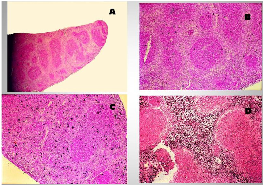 Staphylococcal enterotoxin B (SEB) induces apoptosis in mouse Spleen. (A) Normal splenic tissue from a 12 week-old C57BL/10J mouse as seen in 10× magnification and 20× (B); Representative Peyer’s patch tissue excised from a 12 week-old C57BL/10J mouse gavaged with SEB is shown in 20× magnifcation (C) and 40× (D). Tissues were excised 6 days following oral treatment. Immunohistochemical TUNEL staining of the tissues was performed where darkly stained cells are indicative of apoptosis. Note the darkly-stained apoptotic cells in the expanded follicular area of the SEB-treated spleen section. Staining was performed using a Trevigen TACSR TdT In Situ Apoptosis Detection Kit.