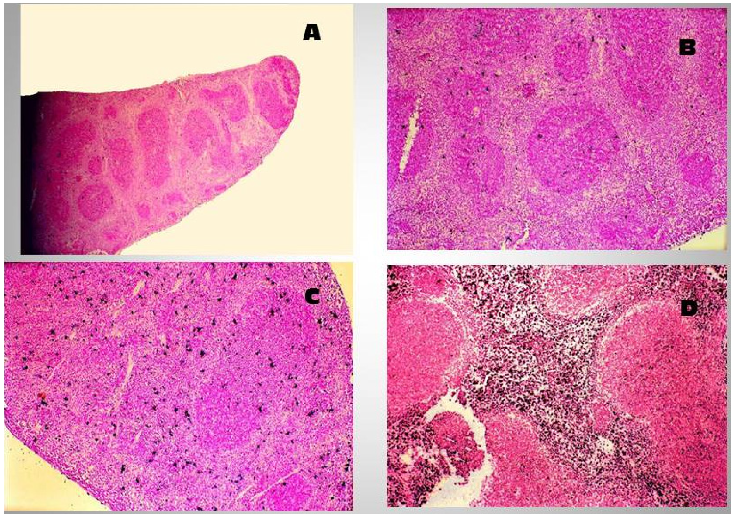 When ingested, SEs of the classic serotypes function both as potent gastrointestinal toxins and superantigens; however, they also possess the ability to traverse the intact intestinal epithelium. This was demonstrated using a mouse model using B10.BR mice that were inoculated orally with either SEA or SEB. Blood serum obtained from these animals induced IL2 production in T hybridomas bearing the appropriate surface TCR, providing strong evidence that the toxin(s) readily crossed the intact intestinal epithelium. Using an in vitro culture system, Hamad and coworkers further showed that MHC class II-negative human intestinal epithelial cells (Caco-2) can transcytose SEB and other bacterial superantigenic toxins in a dose-dependent manner [83]. Interestingly, mutated SEB containing either a mutation in the TCR biding site (N23) or a mutation in the area that binds the MHC class II molecule (F44) were weak stimulators of T cell proliferation [84]. In their study, Hamad and coworkers demonstrated a marked reduction in transcytosis, indicating the importance of these residues in transcytosis [83]. SEB exposure has also been shown to reduce the expression of mucosal tight-junction and adherent-junction proteins, leading to increased permeability and intestinal secretion [85,86]. The disturbance of the intestinal epithelial tight junction is probably associated with the enhanced secretion of IFN-γ and tumor necrosis factor (TNF) from lymphocytes. SEB treatment of rabbit intestinal segments instigates a rapid and large amount of structural destruction, and the damaging effect of SEB appeared to be more prominent in the small, rather than in the large, intestine. The primary target of the toxin was the epithelial cells along the length of the villi, followed by the lamina propria [87]. When ingested, SEs may cause emesis, exaggerated intestinal peristalsis, and pronounced alteration in intestinal mucosa structure when administered enterally in monkeys, dogs, or pigs [27]. The extent of the response reflects the toxin’s superantigenic capacity, by which SEs activate gastrointestinal T cells and provoke a “cytokine storm”. The numerous cytokines released include Th1 (IL-2 and IFN-γ), Th2 (IL-4), and Th17 (IL-17) cytokines from CD4+ T lymphocytes as well as IL-1β, IL-6, IL-8, and TNF from activated macrophages and other cell types. These cytokines may act as chemoattractants and induce expression of adhesion molecules, favoring localization of diverse immune cells responding to SE challenge. Notably, distinct cytokines stimulate functional maturation of immune cells and boost their response to SEs. In addition, many cytokines can affect intestinal epithelial cell functions, particularly ion and water transport. Early research in which rats were fed, portrayed the striking events induced by the toxin within the gastrointestinal tract; specifically, a rapid inflammatory response, confined primarily to stomach and duodenum [88]. The upper gastrointestinal tract of the challenged rats displayed a marked infiltration of different types of inflammatory cells in the epithelium and lamina propria, with some evidence of subepithelial edema and watery exudate containing cells and mucus. In a mouse model, intragastric administration of SEB has been shown to induce an early activation and expansion of responsive Vβ8+ T cells in PP and MLN [89]. RT-PCR analysis of cytokine mRNA in purified Vβ8+ T cells showed that SEB significantly upregulated the mRNA expression of IL-2 and IFN-γ. In the MLN, mRNA specific for IL-2 was increased by 100-fold and IFN-γ mRNA was increased 20-fold. In the spleen, mRNA for IL-2 was increased 10-fold, while IFN-γ was increased 5-fold. Data derived from this laboratory has demonstrated that ingestion of SEB by C57Bl/10J mice can result in a dose-dependent induction of hyperplastic proliferation in peripheral lymphoid organs such as the spleen (Figure 1), resulting in a hyperplastic proliferation that alters the normal follicular architecture in spleen and Peyer’s Patches (Figure 2) by 6 days after ingestion of the toxin [90] and a marked increase in apoptotic events as evidenced in both the spleen and Peyer’s Patches of treated mice when compared to normals. Further, ingestion of the toxin will also induce dramatic changes with respect to the localization of B220+ cells in the PP of the gastrointestinal tract [91]. In other research, intraperitoneal administration of SEB has triggered enterocolitis in mice [81,82] and rats [85,92,93], marked by intestinal recruitment of innate immune cells, activation of T helper lymphocytes, and enhanced release of TNF and IFN-γ. Intraepithelial lymphocytes are thought to play an important role in the pathophysiologic response to Staphylococcal infection. SEB challenge has also been shown to increase the γδ T lymphocyte population in PP, lamina propria, and epithelium [92]. Further, in the presence of SEB, human jejunal IEL have exhibited an enhanced in vitro cytotoxic effect on human C1R B-lymphoblastoid cells and IFN-γ pretreated colonic adenocarcinoma cell clone (HT-29). This response was greater than what is induced by using IEL that were activated with either phytohaemagglutinin (PHA)-, IL-2-, or anti-TCR antibody. In this report, the enhanced cytotoxicity demonstrated by SEB-treated IEL, did not engage MHC class II, TCR, or CD1d [94].