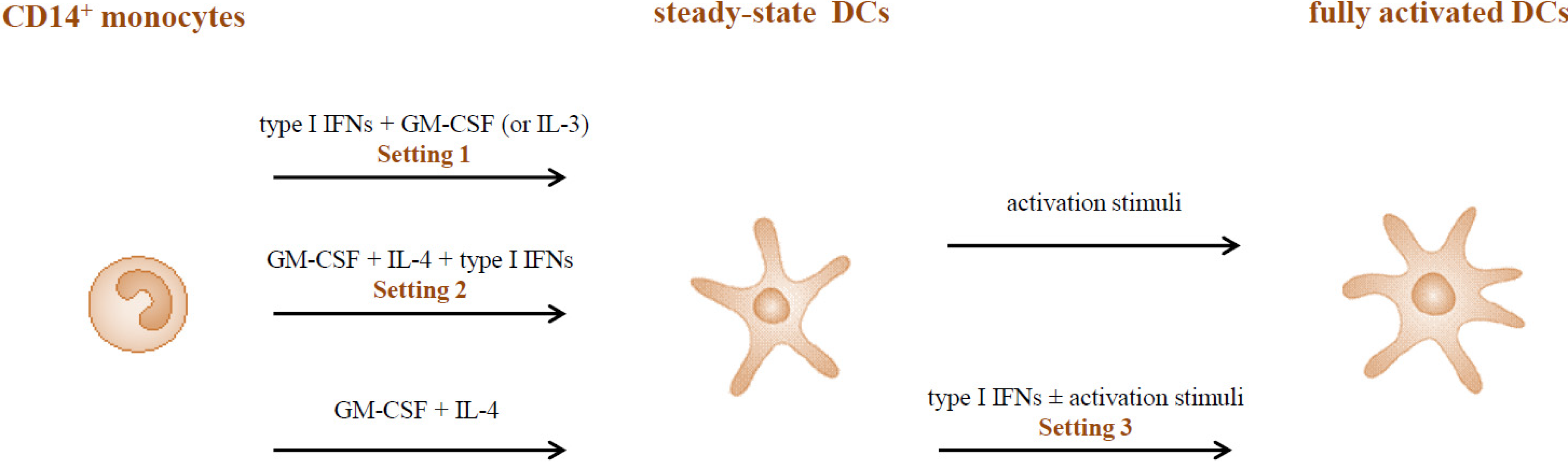 The role of type I IFNs in the development of DCs as well as in the regulation of their functional activity has been investigated in a large number of studies. However, differences in the experimental setting, timing of IFN addition and culture conditions, render somehow difficult a direct comparison of results, yielding in some cases apparently contradictory data. As shown in Figure 1, different experimental settings have been used to test the effect of type I IFNs on the generation/activation of human DCs. Many studies investigated the effect of these cytokines, added together with either GM-CSF or IL-3 to freshly isolated monocytes (Setting 1). The phenotype and function of IFN-generated DCs (IFN-DCs) were characterized at the steady-state as well as upon further stimulation by activation/maturation factors. Conversely, after the report by Luft and co-workers [24] that type I IFNs accelerate the differentiation of CD34+ progenitors to DCs when added together with GM-CSF, IL-4 and TNF-α, subsequent studies investigated the influence of IFNs in the differentiation of DCs with GM-CSF and IL-4, referred to as IL-4-DCs (Setting 2). As above, DCs generated under these experimental conditions were analyzed as such or after further activation. Finally, type I IFNs were also tested for their ability to affect the maturation of IL-4-DCs, either alone or in combination with other activation stimuli (Setting 3).