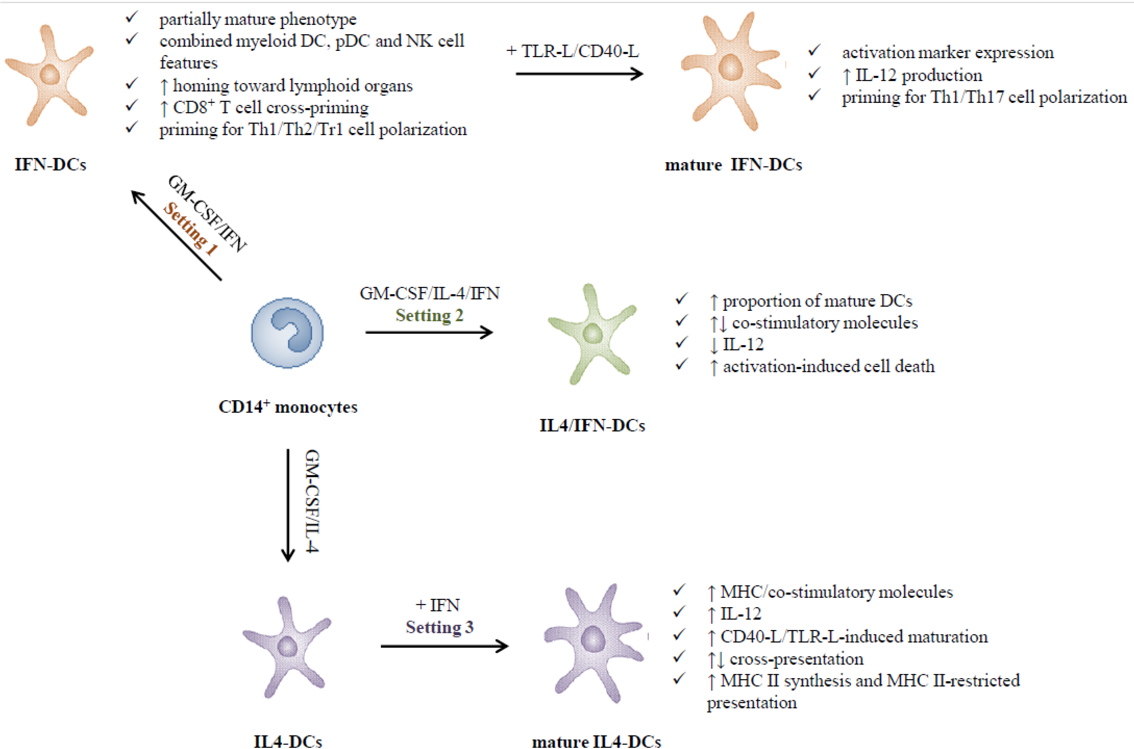 Since the report by Paquette and colleagues [22], the majority of studies, including ours, confirmed and extended the finding that type I IFNs, mostly IFN-α, in combination with GM-CSF or IL-3, promote the differentiation of DCs from both monocytes and CD34+ hematopoietic progenitors, leading to a deep characterization of their immunophenotype and functional features. Table 1 lists the main phenotypic and functional properties of IFN-DCs (Setting 1). Exposure of monocytes to GM-CSF plus type I IFNs leads, within 3 days, to loss of plastic adherence associated with cellular aggregation in large clusters, and appearance of typical DC morphology [21,22,25]. These cells express major histocompatibility complex (MHC) molecules class I and II, co-stimulatory markers (CD25, CD40, CD80 and CD86), adhesion molecules (CD54, CD58) [21,22,25,26,27] and cellular factors involved in antigen uptake and processing, CD8+ T cell cross-priming, and in priming of CD4+ T lymphocytes [21,22,25,26,27,28]. Conversely, low levels of expression of CD14 are retained during the differentiation process [21,22,29]. The IFN-induced differentiation is irreversible and, in contrast to that driven by GM-CSF and IL-4, persists upon removal of the cytokines [21,25]. In addition to IFN-α, the combination of GM-CSF and IFN-β turned out to be very efficient in inducing monocyte differentiation into DCs endowed with phenotypic features very similar to those observed in the presence of IFN-α [30,31,32]. In some studies, GM-CSF was replaced by IL-3, yielding DCs with mostly, but not completely, overlapping features [29,31,33].