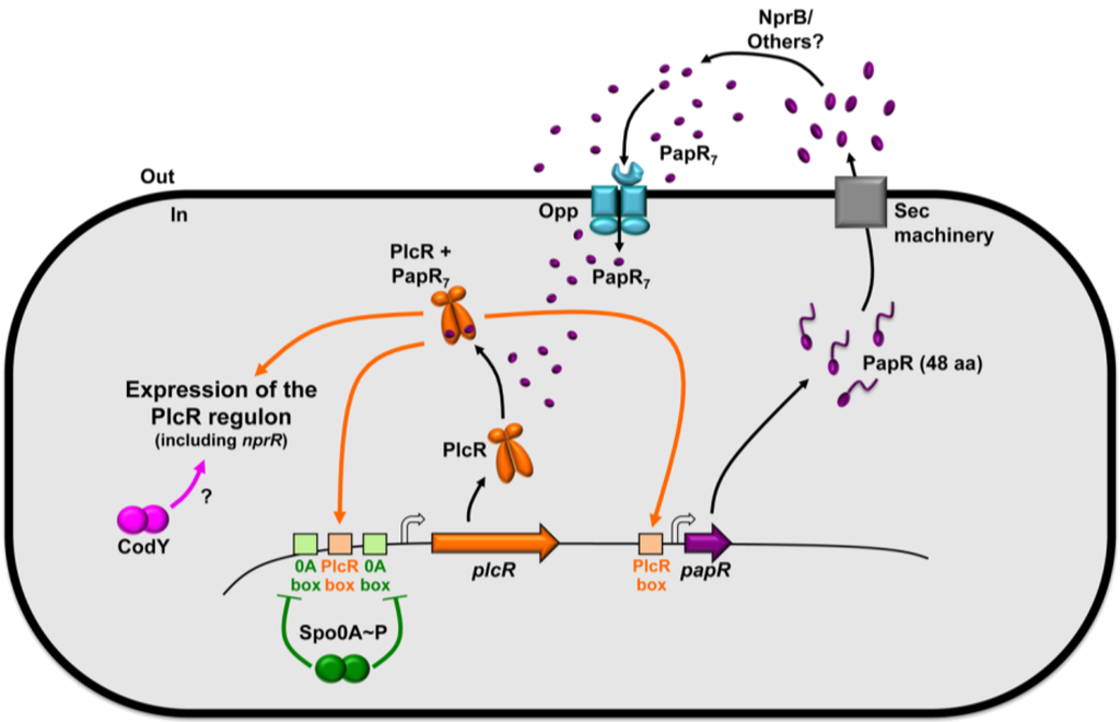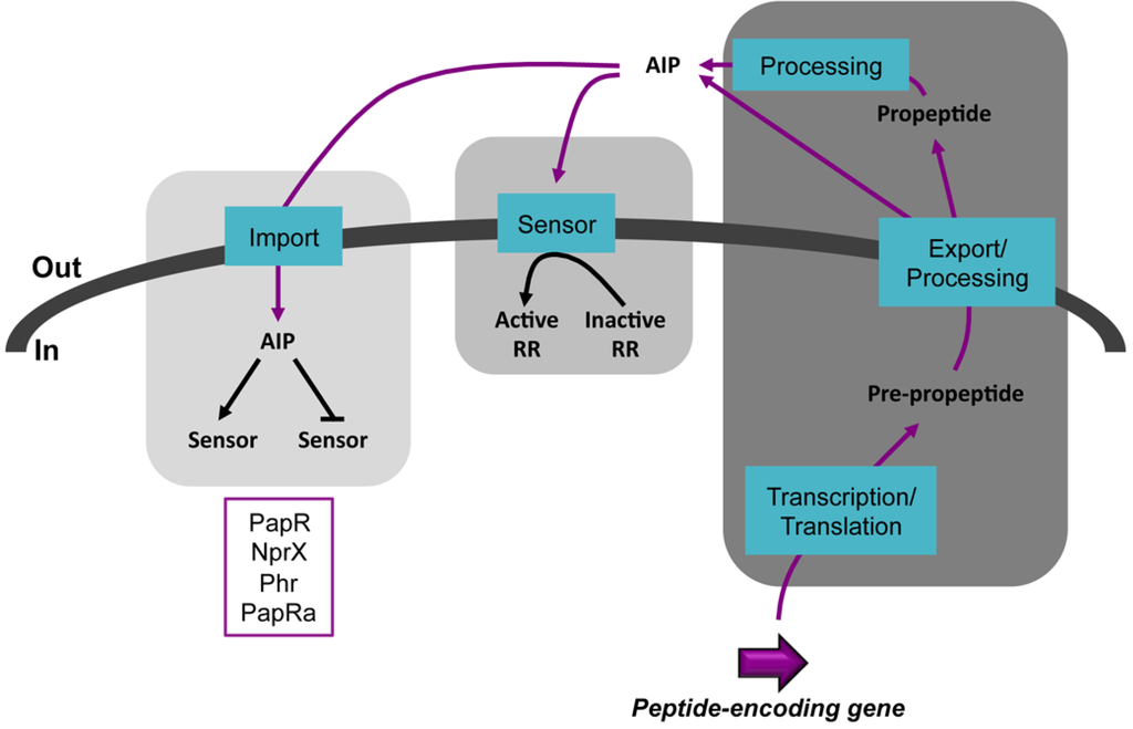 - Perego, M. Forty years in the making: Understanding the molecular mechanism of peptide regulation in bacterial development. PLoS Biol. 2013, 11, e1001516. [Google Scholar] [CrossRef]