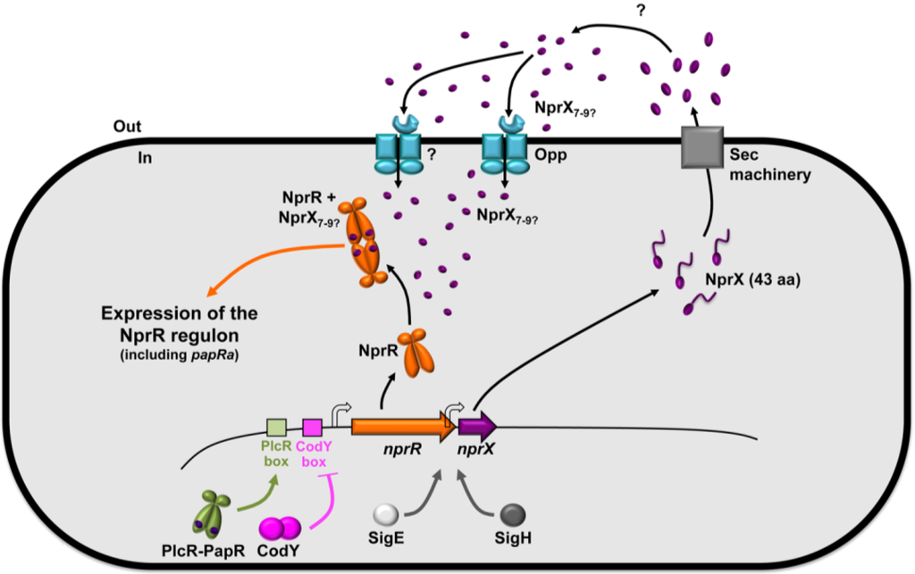 - Dubois, T.; Perchat, S.; Verplaetse, E.; Gominet, M.; Lemy, C.; Aumont-Nicaise, M.; Grenha, R.; Nessler, S.; Lereclus, D. Activity of the Bacillus thuringiensis NprR-NprX cell-cell communication system is co-ordinated to the physiological stage through a complex transcriptional regulation. Mol. Microbiol. 2013, 88, 48–63. [Google Scholar] [CrossRef]