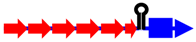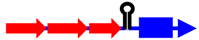 Inhibition of type III toxin activity by antitoxin binding. As exemplified by ToxIN, the antitoxin toxI (red) and the toxin toxN (mRNA, blue; protein, black) are in a bicistronic operon with a Rho-independent terminator that separates them. The antitoxin (red) RNA ToxI is processed by ToxN, and upon processing, it can bind to preformed ToxN protein.