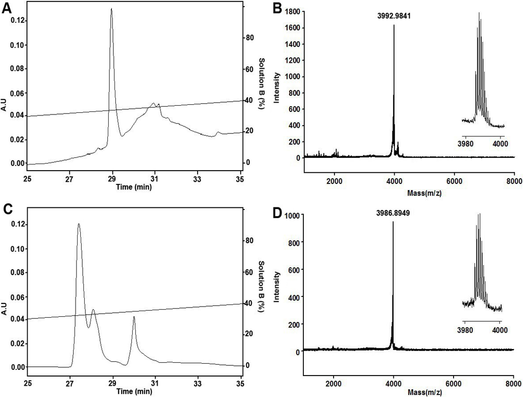 RP-HPLC purification and MALDI-TOF-MS of reduced and refolded μ-TRTX-Hhn1b. (A) Purification of linear reduced peptide; (B) MALDI-TOF-MS of linear reduced peptide; (C) purification of refolded/oxidized peptide; (D) MALDI-TOF-MS of refolded/oxidized peptide.