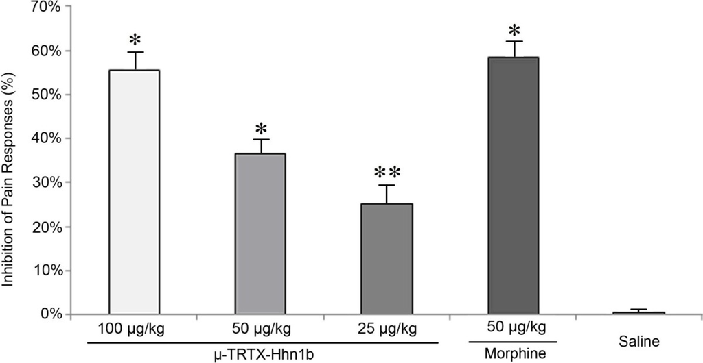 The analgesic effect of μ-TRTX-Hhn1b in the mouse abdominal constriction test. μ-TRTX-Hhn1b and morphine were administrated by i.p. injection 15 min before acetic acid application. Data are represented as the mean ± SEM of six animals per group. ** p < 0.05, * p < 0.01.