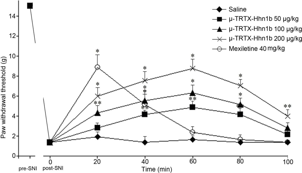 Effect of μ-TRTX-Hhn1b in the rat spared nerve injury (SNI)-induced allodynia model of neuropathic pain. The dose-response of the effect of μ-TRTX-Hhn1b was determined by using von Frey filaments to assess mechanical stimulation. μ-TRTX-Hhn1b significantly reversed SNI-induced allodynia at 50–200μg/kg. Data was represented as the mean ± SEM of six animals per group. ** p < 0.05, * p < 0.01.