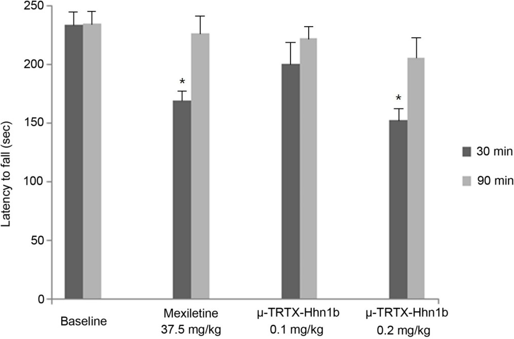 Motor side effects of μ-TRTX-Hhn1b were examined in rats by the rotarod latency test. At the beginning of the rotarod test, trained rats were tested 0 min before (baseline) and 30 and 90 min after μ-TRTX-Hhn1b or mexiletine administration. The latency to fall off the rotarod apparatus was determined from the mean time in three trials for each rat at each time. Data are represented as the mean ± SEM of six animals per group. * p < 0.05.