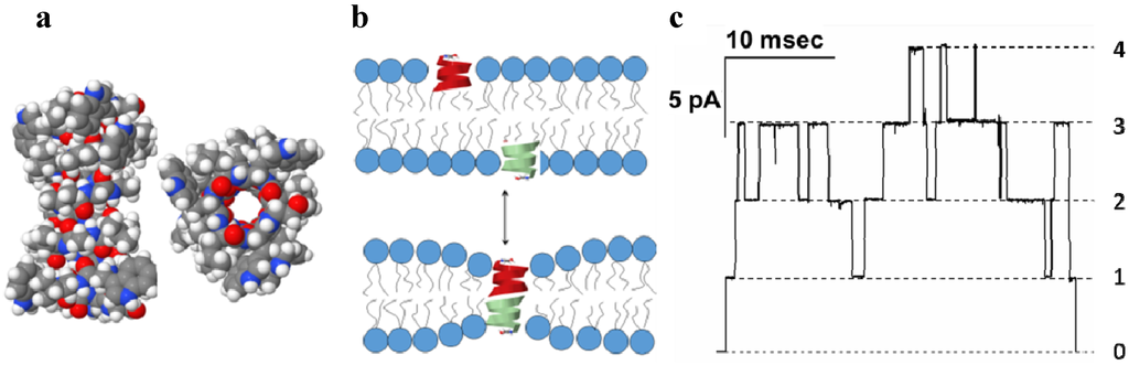 (a) Side and end views of the bilayer-spanning gramicidin A (GrA) channel. The energy-minimized structure represents a composite consistent with several NMR structures (PDB 1GRM, 1MAG); (b) GrA channels formed by the transbilayer dimerization of two β-helical subunits; (c) Single-channel current trace obtained with GrA in diphytanoylphosphatidylcholine bilayer [34]. Reprinted and modified with permission from reference [34].