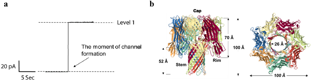 (a) Typical recording of a single αHL channel reconstituted into diphytanoyl-phosphatidylcholine membrane. Applied voltage is 100 mV. Channel current corresponds to ~100 pA in 1M KCl, pH 7.4; (b) Crystal structure of the αHL heptamer (top and side views are shown) (PDB 7AHL) [78]. The mushroom-shaped complex is approximately 100 Å tall and up to 100 Å in diameter, and the stem domain measures about 52 Å in height and 26 Å in diameter.