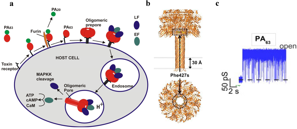 First, full length PA83 binds to the CMG2 and TEM8 receptors [103,104] on a host cell surface and is subsequently cleaved by extracellular furin protease to PA63 [105]. PA63 then undergoes oligomerization, which leads to formation of heptameric, (PA63)7 [106] and octameric, (PA63)8 [107] ring-shaped prepores. The formation of (PA63)7 and (PA63)8 generates, correspondingly, three [108] and four [107] LF/EF binding sites at the interface of two adjacent PA63 molecules and causes receptor-mediated endocytosis of the anthrax toxin tripartite complexes [109]. The oligomeric PA63 prepore then undergoes significant structural changes promoted by the acidic endosomal environment, which results in the formation of a mushroom-shaped ion channel (125 Å in diameter with 70 Å long cap, and 100 Å long stem [110]) (Figure 3b), preferentially selective to cations [15]. When incorporated into the bilayer lipid membranes, PA63 was reported to form ion-permeable cation-selective ion channels [15,111,112] prone to voltage-dependent closures typical for the other β-barrel channels. The characteristic property of PA63 single channels as well as the channel-forming components of binary clostridial C2 and iota toxins reconstituted into bilayer membranes is the non-voltage-dependent flickering of ion current between the open and completely closed states [16,17,113,114,115] (Figure 3c). Interestingly, the current noise of the F427A (ϕ-clamp) mutant (see Section 5.2) of PA63 is mostly free of this complex behavior [115]. A PA oligomer then is believed to act as an effective translocase, which unfolds and translocates LF and EF inside the cell using the proton gradient across the endosomal membrane (pHendosome < pHcytosol) [116,117,118,119,120,121]. In an alternative model, the anthrax toxin catalyzes rupture of the endosomal membrane and toxic complexes are released into the cytosol [18]. Once in the cytosol, LF and EF actuate their catalytic actions. LF is a Zn-metalloprotease that cleaves mitogen-activated protein kinase kinases [122,123] and NLrp1 [124], resulting in disturbing host cell signal transduction. EF is a calmodulin-dependent adenylyl cyclase, which increases the cAMP level in the cells, contributing to dissemination of Bacillus anthracis in the host [125]. The key tissue targets responsible for the poisonous effect of LT and ET were recently identified [126]. LT and ET were shown to target the cardiovascular system and liver, respectively.