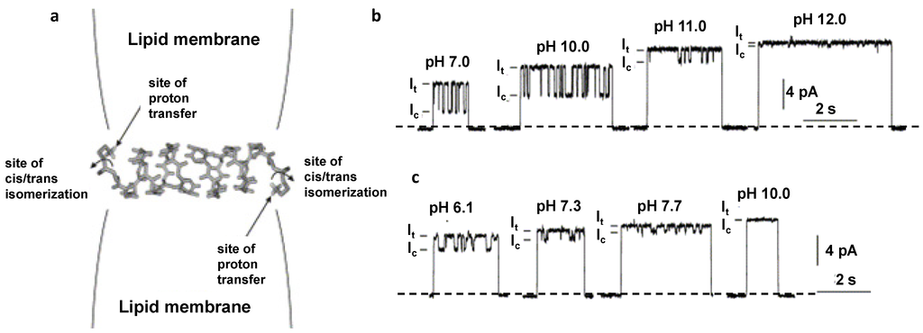 (a) Model representation of the engineered GrA-ethylenediamine channel in a lipid bilayer [49]. At both entrances of the channels, an ionizable site (the primary amino group in gram-ethylenediamine; the imidazole group in gramicidin-histamine) is connected to the gramicidin backbone via a carbamate linkage). Representative single-channel currents of gramicidin-ethylenediamine (b) and gramicidin-histamine (c) at different pH values [49]. The closed channel states are seen as the zero current levels. The currents of the trans (It) and cis (Ic) isomeric states of the channel are indicated. Reprinted and modified with permission from reference [49]. ScienceDirect open archive.