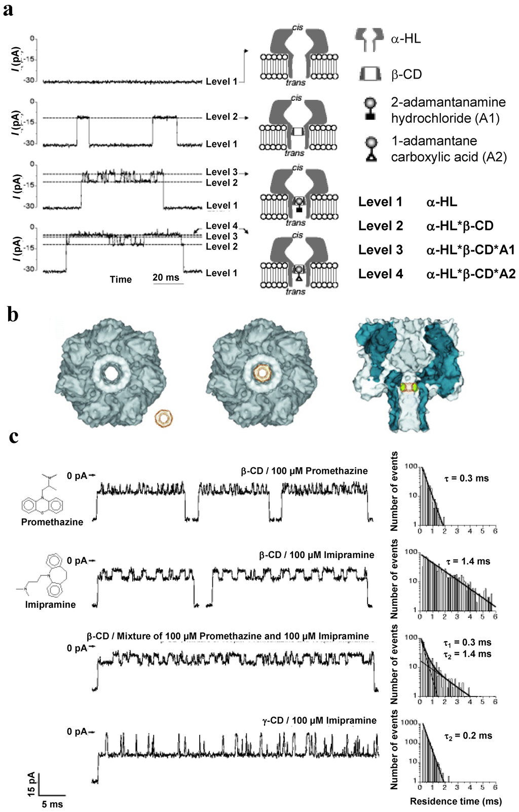 (a) Bilayer recordings showing the interaction of a single αHL pore with β-cyclodextrin and model analytes 2-adamantanamine and 1-adamantanecarboxylic acid; (b) Molecular graphics representation of the interaction between αHL and cyclodextrin; (c) Analysis of drug molecules by stochastic sensing with αHL and a βCD or γCD adapter. Reprinted and modified with permission from reference [139]. Copyright 1999 Nature Publishing Group.