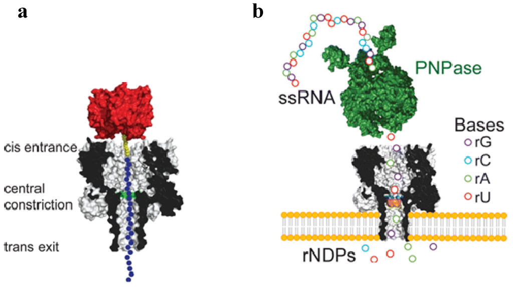 A αHL nanopore can be used to detect the single nucleotides in single-stranded DNA or RNA molecules. (a) A homopolymeric DNA oligonucleotide (blue circles) can be immobilized inside the αHL pore with a biotin (yellow)/streptavidin (red) linkage [199]; (b) Detection of the individual nucleotides cleaved from a single stranded RNA by polynucleotide phosphorylase [205]. Schematic representation of RNA oligonucleotide (circles) digested by polynucleotide phosphorylase (PNPase, green), one base at a time. The unbound nucleotides (rNDPs) are detected by the mutant M113R αHL (mutation highlighted in blue) pore equipped with a cyclodextrin adapter (orange). Reprinted with permission from references [199,205].