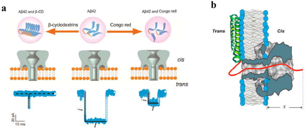 Nanopore analysis was also suggested for studying the misfolding of certain proteins, for instance amyloids, α-synucleins and prions [230,231]. The αHL pores were used to probe the different aggregation transition of β-Amyloid 42 (Aβ42) (Figure 9a) [231].