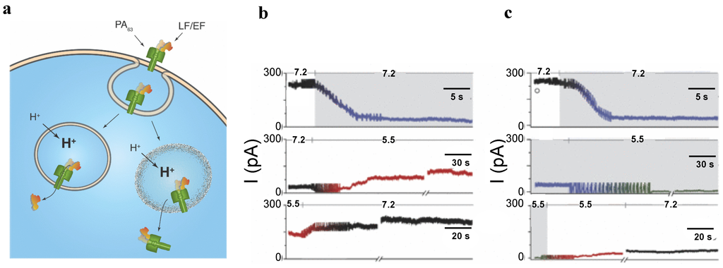 Kasianowicz et al., question the translocation model, noting that the in vitro pH gradient formation used in the previous translocation studies is precisely opposite to what occurs in vivo [18]. The translocation, manifested by PA63 ion current recovery (Figure 10), was observed either in static low pH conditions on both sites of the membrane (mostly with LFN) or starting with the symmetrical acid conditions and forming a pH gradient by raising the trans solution pH (both with LFN, EFN, LF, and EF). In the real in vivo systems, PA63 oligomeric prepore complexes would first bind the LF and/or EF subunits on the cell surface, then undergo endocytosis, and, after that, under pHendosome < pHcytosol conditions, the prepore/pore transition would occur. To support the alternative anthrax toxin uptake model, the authors show that anthrax toxin complexes can rupture both the planar bilayer and the droplet membranes [18]. Moreover, the transmembrane pH gradients alter the ion conducting properties of the PA63 pores and LF/PA63 interaction. In particular, under conditions that mimic those across the endosomal membrane, the strength of LF/PA63 interaction in the absence of LF excess in the solution is relatively weak. However the LF binding is irreversible when LF is present in bulk during acidification [18]. To understand the binding of LF/EF to the channel, the authors designed an experiment starting from essentially different experimental conditions (Figure 11b) compared with those used for the translocation experiments. PA63 channels were incorporated into the planar bilayer membranes under symmetrical pHcis = pHtrans = 7.2 conditions (Figure 11b, top). Following channel formation, LF was added to the cis compartment solution and the remaining unbound LF was flushed from the chamber. Lowering the pH cis solution to 5.5 led to a slow current increase (Figure 11b, middle) explained by dissociation of LF from the channel; the current continued to increase when pH was increased to 7.2 (Figure 11b, bottom). About 90% of current recovery was observed after 30 min [18]. To show that acidification promotes the LF dissociation from the channel, the authors repeated the experiment (Figure 11c) maintaining the bulk cis-solution LF concentration at constant during the acidification. For that purpose, the cis solution was perfused with the LF containing pH 5.5 buffer (Figure 11c, middle). After that, the solution was additionally perfused with LF-less pH 5.5 buffer (Figure 11c, middle). The described procedure led to only minor increase in the current even after pH was return to 7.2 (Figure 11c, bottom). Thus, about 90 min after returning to initial pHcis = pHtrans = 7.2 conditions, only 17% of the initial PA63 current was recorded, indicating strong, nearly irreversible LF/PA63 interaction when [LF]bulk = 1 nM during acidification. The authors also showed that when LF or EF were in the bulk during acidification of the cis side, the formation of the essentially irreversibly bound LF:PA63 and EF:PA63 complexes led to membrane rupture.