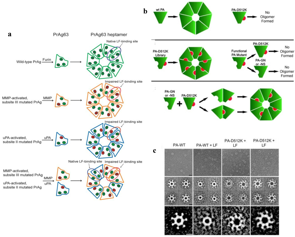 - Phillips, D.D.; Fattah, R.J.; Crown, D.; Zhang, Y.; Liu, S.; Moayeri, M.; Fischer, E.R.; Hansen, B.T.; Ghirlando, R.; Nestorovich, E.M.; et al. Engineering anthrax toxin variants that exclusively form octamers and their application to targeting tumors. J. Biol. Chem. 2013, 288, 9058–9065. [Google Scholar] [CrossRef] [PubMed]