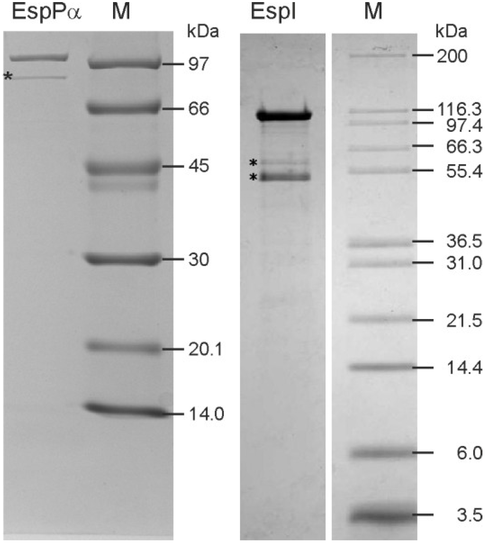 Purification of EspPα and EspI (left) SDS-PAGE of purified EspPα. *, EspPα autoproteolysis product; (right) SDS-PAGE of purified EspI. *, EspI autoproteolysis product. M = Molecular weight marker. Purity (including autoproteolysis products) of both samples was >95% as determined by densitometrical analysis of SDS-PAGE gels.