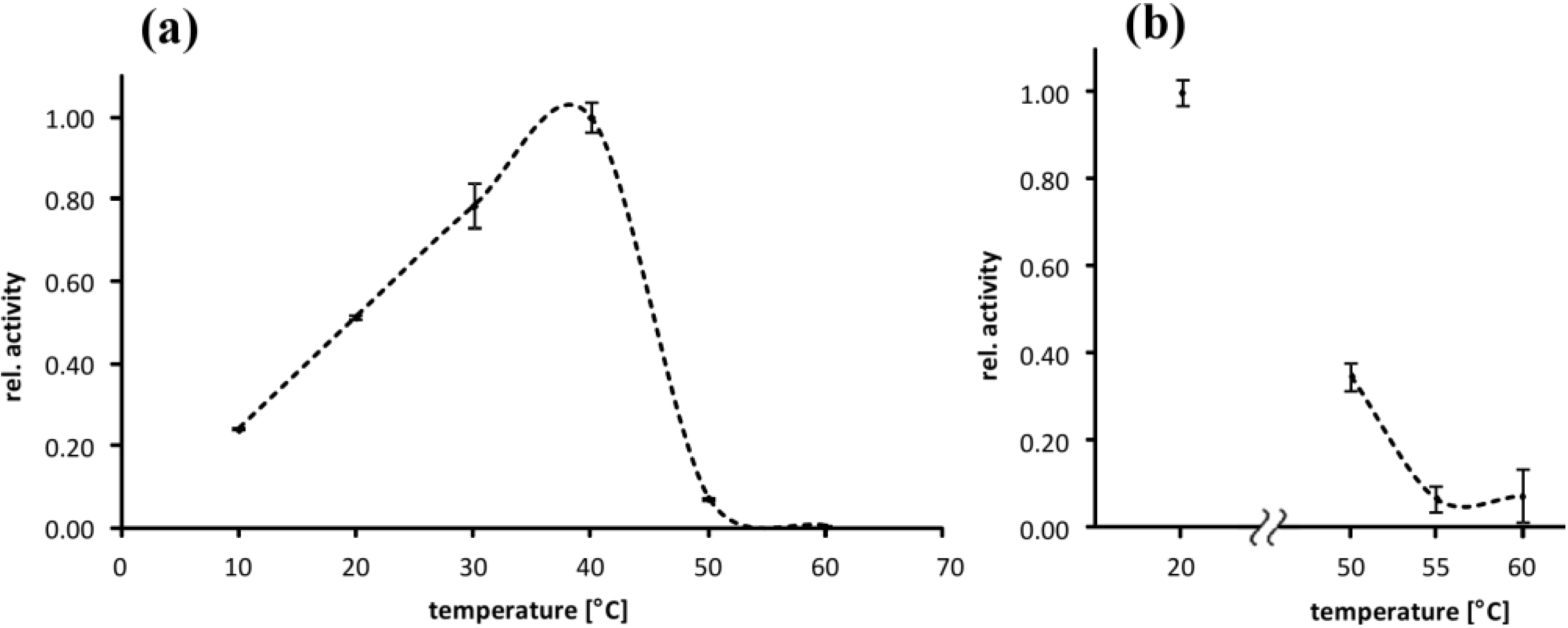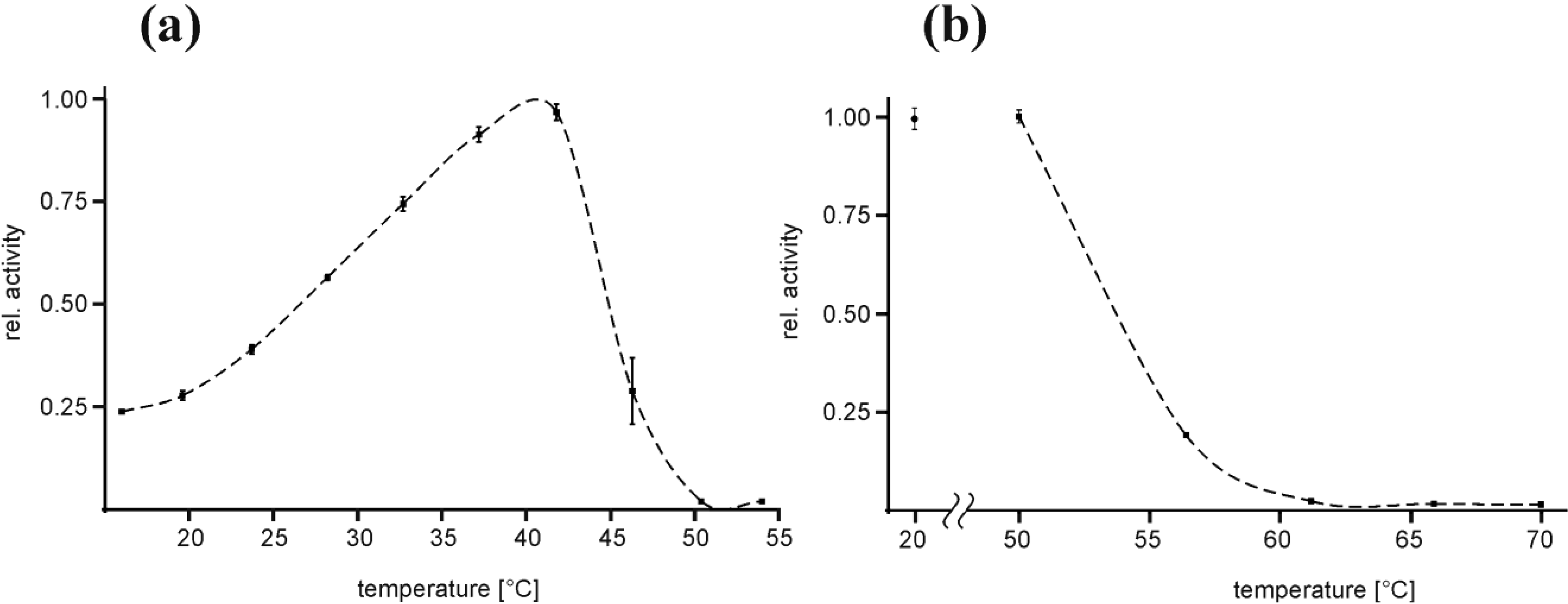 Temperature optimum and heat denaturation of EspI (a) Relative activity of EspI at varying incubation temperatures. Relative activity is normalized to Topt at ~38 °C, n = 3; (b) Effect of 120 min pre-incubation at elevated temperatures on the activity of EspI at 37 °C. Pre-incubation temperatures are given in the x-axis and the relative activity was subsequently determined at 37 °C. The negative control was incubated for 120 min at 20 °C. Relative activity is normalized to the negative control, n = 3.
