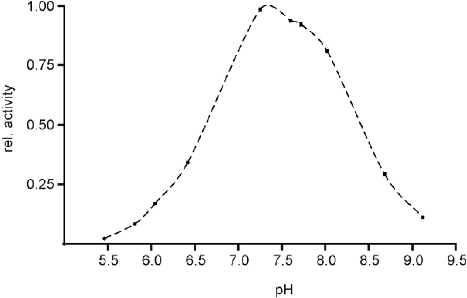 EspI activity shows a pronounced maximum at pH ~7.5 and relative activity of 50% at pH 6.8 and 8.7. Decreasing pH values lead to rapid loss of activity while more alkaline conditions led to only slow reduction of activity (Figure 5).