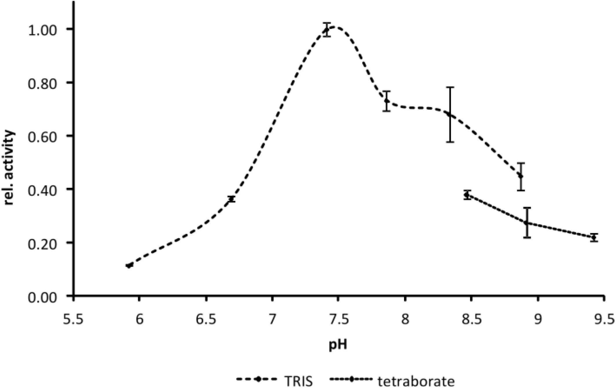 Determination of the pH optimum of EspI. Activity of EspI was determined in the pH range from 5.9 to 9.4. The proteolytic activity is expressed relative to pHopt at ~7.5. Note that EspI activity in TRIS buffer is higher than in tetraborate buffer. n = 4.