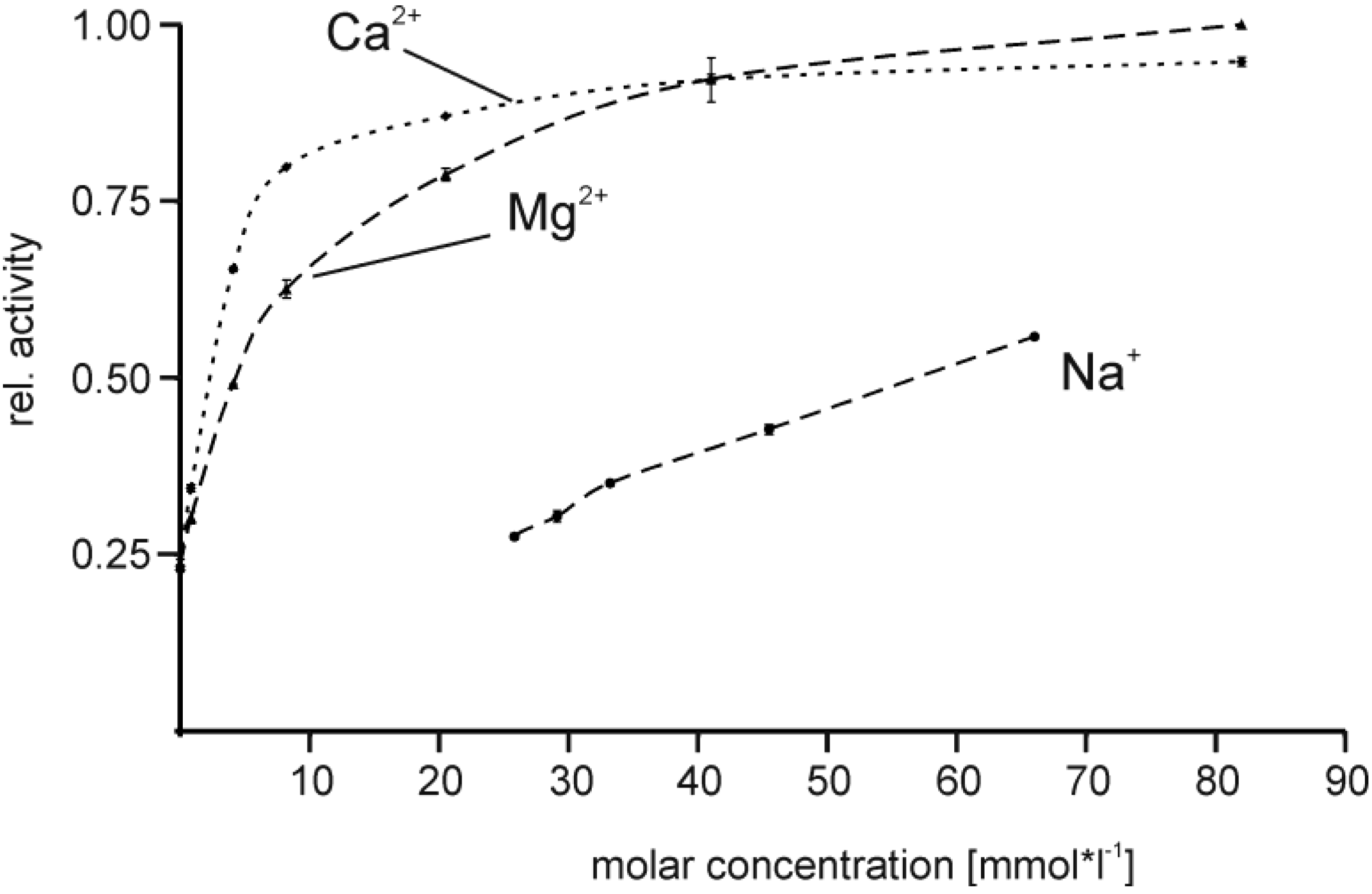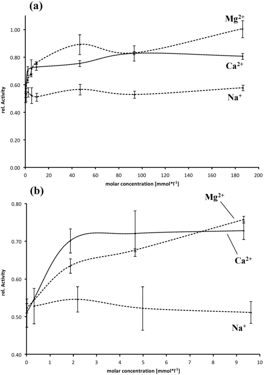 Influence of buffer composition on the activity of EspI. (a) Relative activity is normalized to the maximal activity observed for 186 mM Mg2+, n = 4; (b) Detailed view of cation concentrations in the range from 0 to 9.6 (Na+) or 9.3 mM (Ca2+, Mg2+).