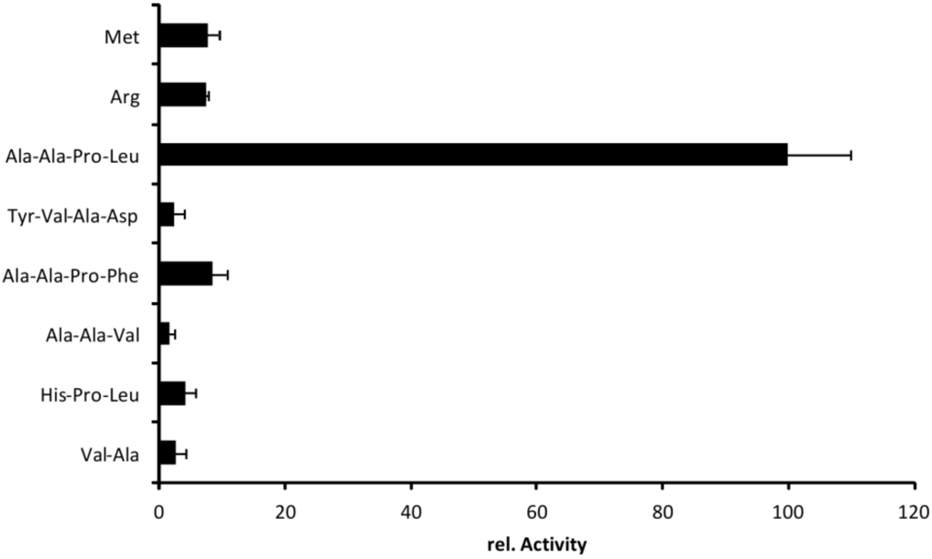 Cleavage profile of EspI. Chromogenic substrates were incubated with EspI. Activity is normalized to the maximal activity observed after incubation of Suc-Ala-Ala-Pro-Leu-pNA, n = 3.