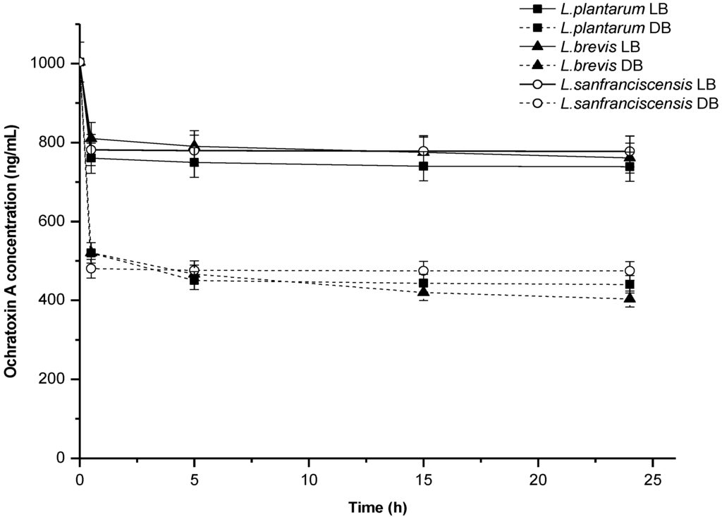 The experiments were conducted using three plant-associated lactic acid bacteria (LAB) strains: Lactobacillus plantarum, L. brevis, and L. sanfranciscensis. They were selected out of six strains belonging to the same species based on comparison of biomass increase in cultures contaminated with 1000 ng/mL OTA versus control media (Table 1).