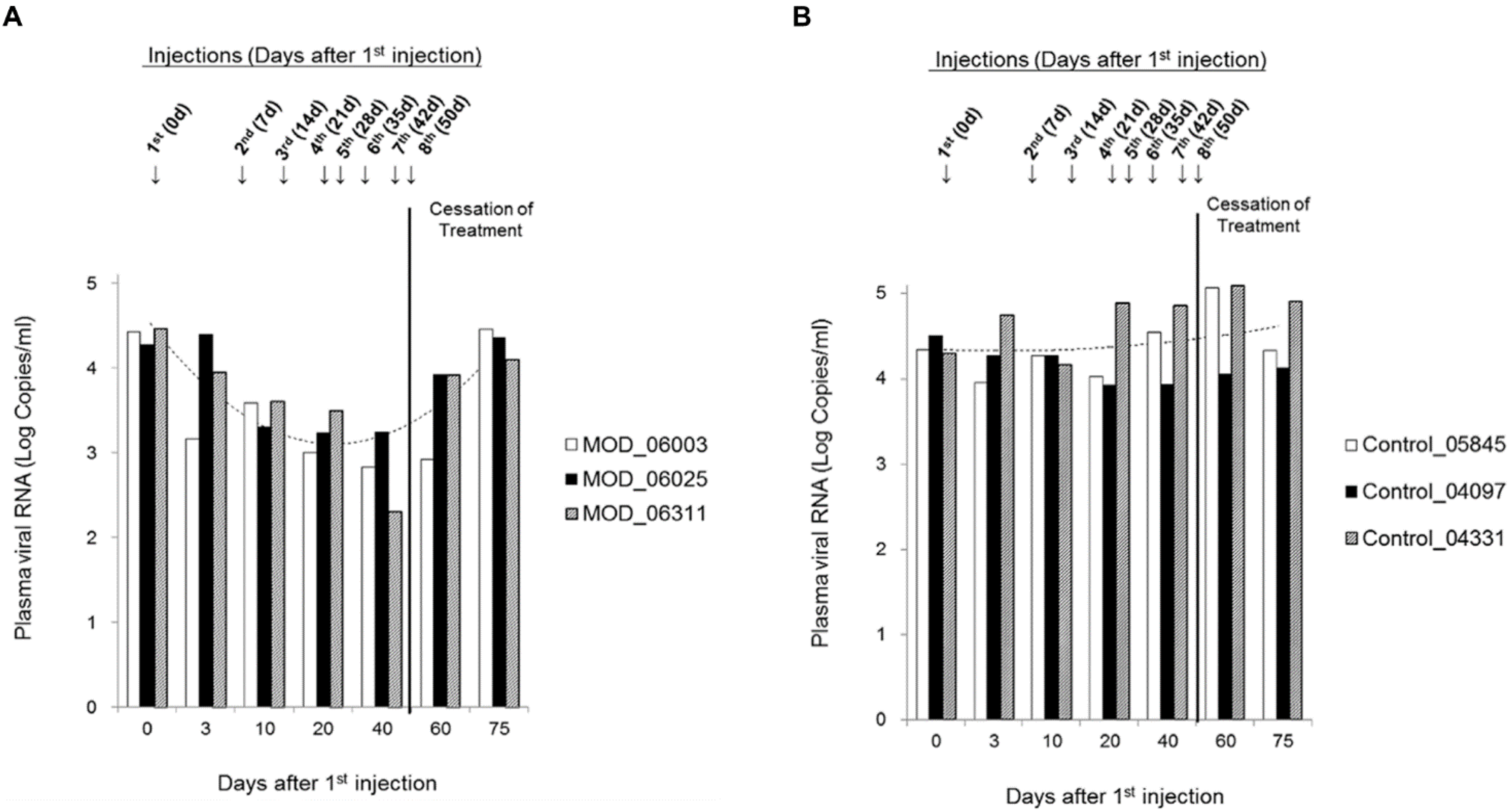 SHIV89.6-infected macaques (weighed 5–14 kg) were randomly assigned to either treatment (#06003, #06025 and #06311) or control groups (#05845, #04097 and #04331). Macaques were administered weekly with either His-TAT-MOD at dose of 50 µg/kg of body weight or normal saline as negative control by intravenous injection at hind legs for eight consecutive weeks. Blood was collected at designated time-points (before treatment and 3, 10, 20, 40, 60 and 75 day after the first injection) for plasma viral load determination. Basic clinical examinations on weight, complete blood count (CBC) testing and liver function were also done throughout treatment period. CBC testing was performed using the Auto Hematology Analyzer (Mindraya, Shenzhen, Guangdong, China) and liver function was detected in First People’s Hospital of Yunnan Province according to the manufacturer’s protocol (SYDW-2012018).
