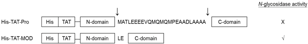 Schematic diagram of maize RIP variants. The artificial maize RIP precursor (His-TAT-Pro) contains a 25aa internal inactivation segment with the native N- and C-terminal regions removed. The inactivation region is naturally cleaved by maize protease in maize at sites denoted by “↓”. His-TAT-MOD is the active form with the N- and C-terminal domains fused by a ‘LE’ linker.