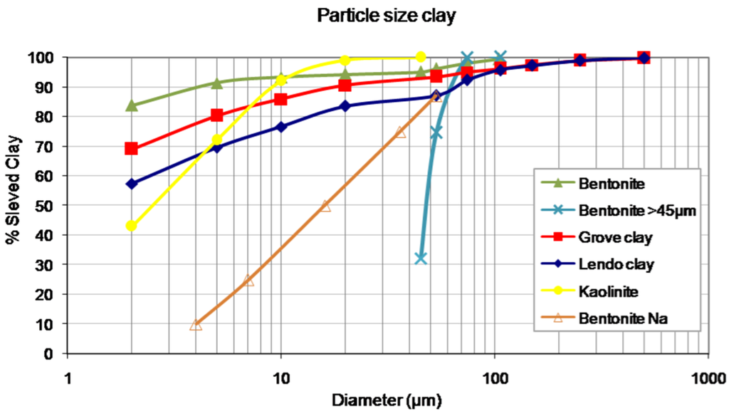 Particle size clay determined from the percentage of sieved clay for each pore diameter: Bentonite (83% < 2 µm), Bentonite > 45 µm (90% > 45 µm), Lendo Clay (57% < 2 µm), Grove Clay (69% < 2 µm), Kaolinite (43% < 2 µm), and Bentonite Na (80% < 70 µm).