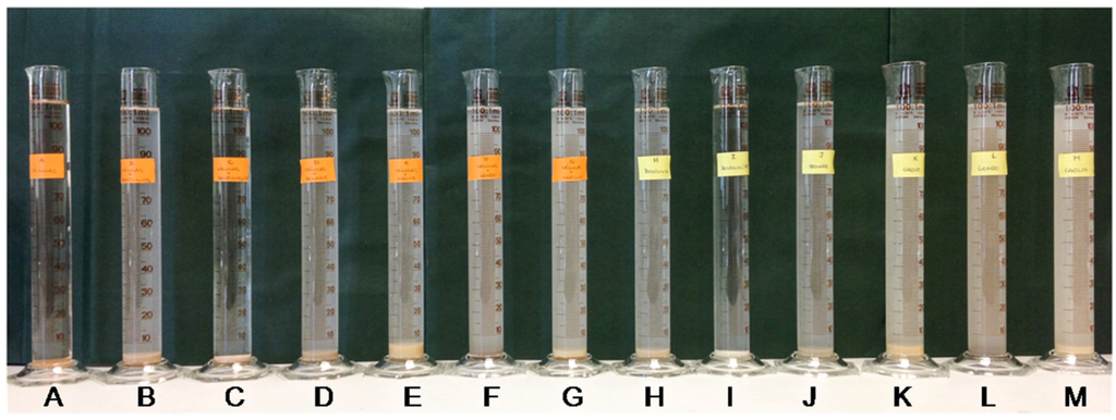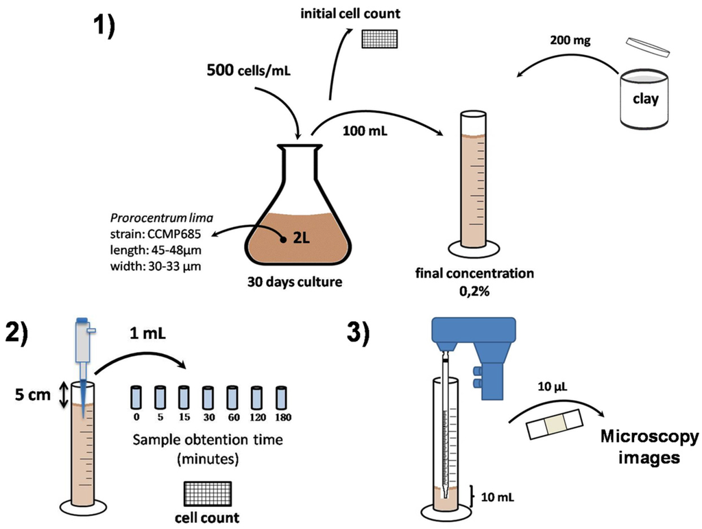 We set up 100 mL water columns with seawater, the corresponding clay (final concentration 0.2%) and the dinoflagellate Prorocentrum lima (Figure 4). The mixtures were allowed to settle by gravity. We tested different concentrations of clays (data not shown) and selected 0.2% based on the removal efficiency. Concentrations higher than 0.2% completed decantation fast, after the clay suspension preparation. However, lower clay concentrations were not effective on flocculation of dinoflagellate cells.